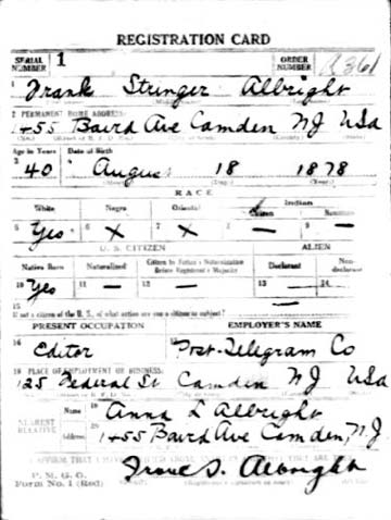 FRANK STRINGER ALBRIGHT was born on August 18, 1878 in New Jersey to Lewis and Margaret Albright. His early years were spent in Gloucester City where his father appears to have been the proprietor of a newspaper in 1880. Lewis Albright relocated to Camden in late 1889 or early 1890, first settling at 603 Clinton Street. The family lived at 448 Broadway at the time of the 1900 Census. Thee were two younger siblings, Lewis and Lillian, then at home, an older brother, William, having passed away. By 1900 Frank S. Albright had already gone into journalism, and was working as a reporter. Shortly after the census was taken, he married Anna Scheperkotter. On November 22, 1903 Judge Charles G. Garrison appointed Frank S. Albright to the eleven person court jury charged with witnessing the execution of murderer Paul Woodward, on January 7, 1903. The execution was carried out as scheduled. Frank and Anna Albright were living at 637 Pine Street when the 1906 City Directory was compiled. A journalist by trade, he was living at 569 Berkley Street with his wife Anna and a daughter, also named Anna, at the time of the 1910 Census. He had stepped away from newspapers for a time in mid-1910s he became secretary to then Mayor Charles H. Ellis. When the 1914 Camden City Directory was compiled the Albrights lived at 1455 Baird Avenue in Camden's then-new Parkside neighborhood. They remained at that address through at least 1929. Frank Albright was an editor with the Camden Post-Telegram when he registered for the draft in 1917. When the Post-Telegram was sold to the Camden Courier, and became the Courier-Post, Frank Albright, a staunch Republican and an ally of Camden Republican leader David Baird Jr., returned to Camden city government. Frank S. Albright was serving as City Publicity Agent in Camden in the January of 1928. He later served as Deputy City Clerk under William D. Brown in the 1920s and early 1930s, whom he succeeded. In November of 1927 Mayor Winfield S. Price appointed a committee to arrange for the observance in February 1928 of the One Hundredth Anniversary of the City of Camden. The committee was composed of Charles S. Boyer, Chairman; t. yorke smith, E.G.C. Bleakly, Mahlon F. Ivins Jr., Fred S. Caperoon and Frank S. Albright. By May of 1933 he had been promoted to City Clerk. Frank S. Albright died in April of 1935 while still in office, and was succeeded by his deputy, Otto E. Braun. |