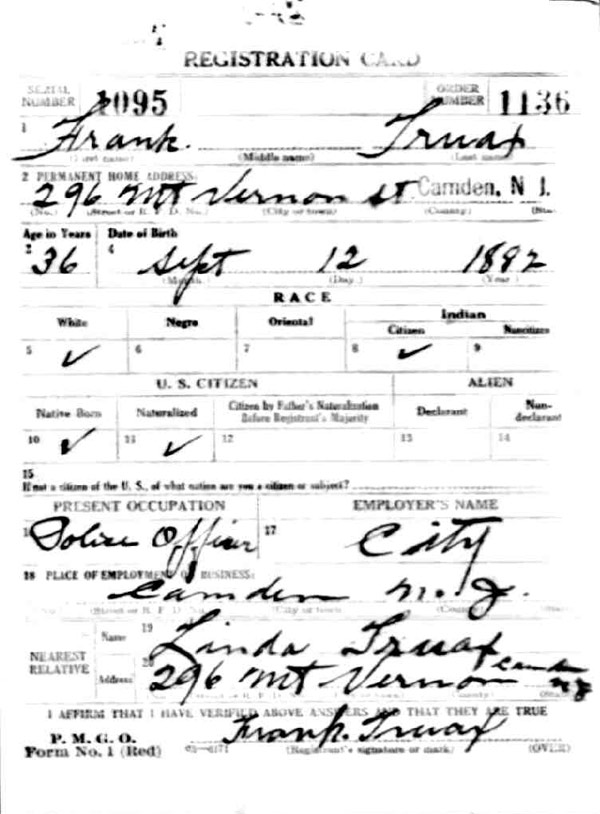 FRANK TRUAX was born on September 12, 1882 to Mr. and Mrs. John Truax in Camden NJ. His father was a trainmaster, grandfather Clayton Truax had served two one-year terms as Camden's Mayor in the late 1850s. The 1900 Census shows John Truax and family living at 636 Mount Vernon Street in Camden's Sixth Ward. Frank Truax was by then working as a machinist. He was still following that trade when the 1910 Census was compiled, boarding at 1048 South 4th Street, then working in a shipyard. He married around 1912. On April 12, 1917 Frank Truax secured an appointment to the Camden Police Department. When he registered for the draft on September 12, 1918 hr was living with his wife Linda at 296 Mount Vernon Street. A Detective by the end of 1927, he was often partnered with Detective Joseph Caputi Sr. The 1929 Camden City Directory shows that Frank & Linda Truax were living at 1139 Kenwood Avenue in Camden's Parkside neighborhood. He had been promoted to Sergeant on April 9, 1930. Frank Truax passed away in July of 1932. His widow was still living at 1139 Kenwood Avenue according to the 1947 Camden City Directory