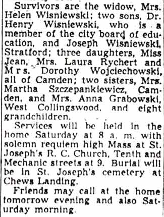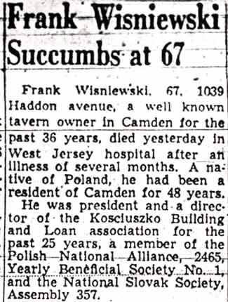 Frank Wisniewski was born in Poland in 1882. He came to America in 1899, and to Camden NJ in 1901. By 1913 he was operating a tavern at 1068 Haddon Avenue in Camden. During Prohibition he was in the wholesale soft drink business. After Prohibition was repealed Frank Wisniewski opened Frank's Cafe at 1039 Haddon Avenue, which he owned and operated until his death on August 10, 1949. The Wisniewski family also operated a tavern at 2277 South 7th Street, in South Camden. Frank Wisniewski was survived by his wife, helen, sons Joseph and Dr. Henry Wisniewski, a dentist and then a member of the Camden Board of Education; three daughters, Mrs. Alura Rychert, Miss Jean Wisniewski, and Mrs. Dorothy Wojciechowski; two sisters, Mrs. Martha Szepankiewicz and mrs. Anna grabowski, and eight grandchildren. Frank Wisniewski was very active in civic affairs. His family is still involved in civic affairs in Camden County to this day. |