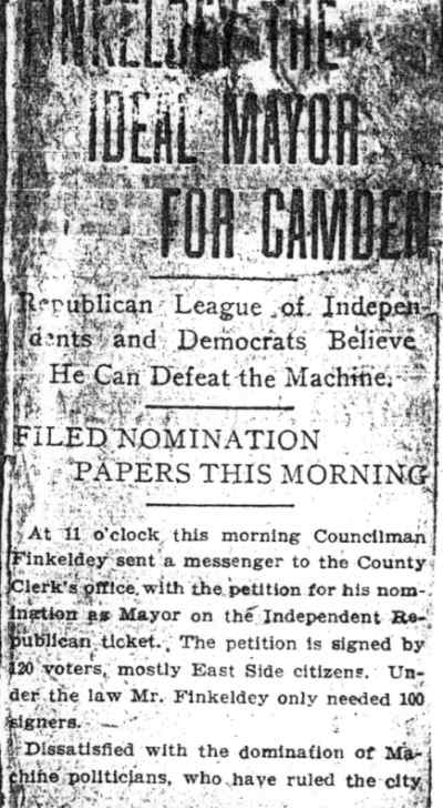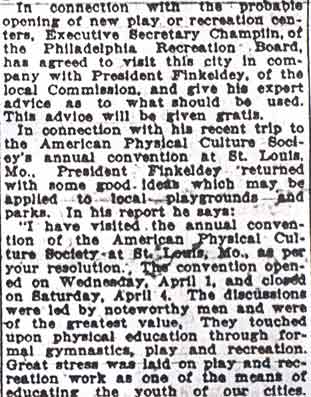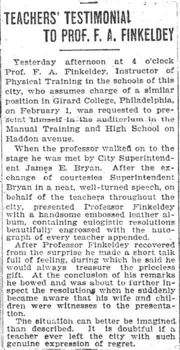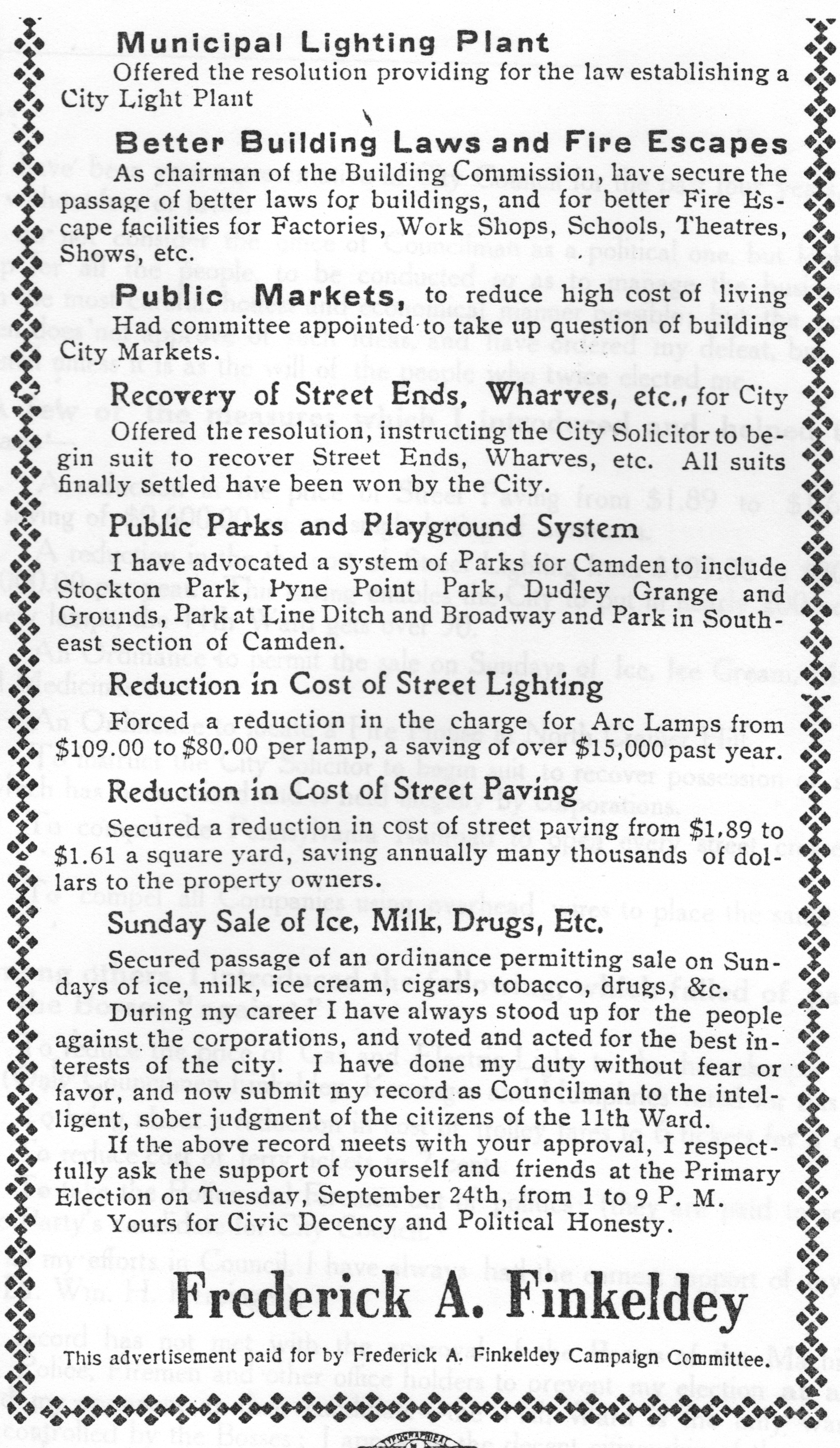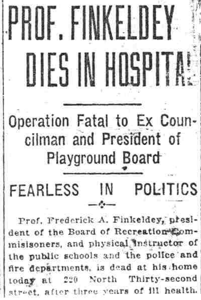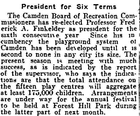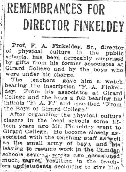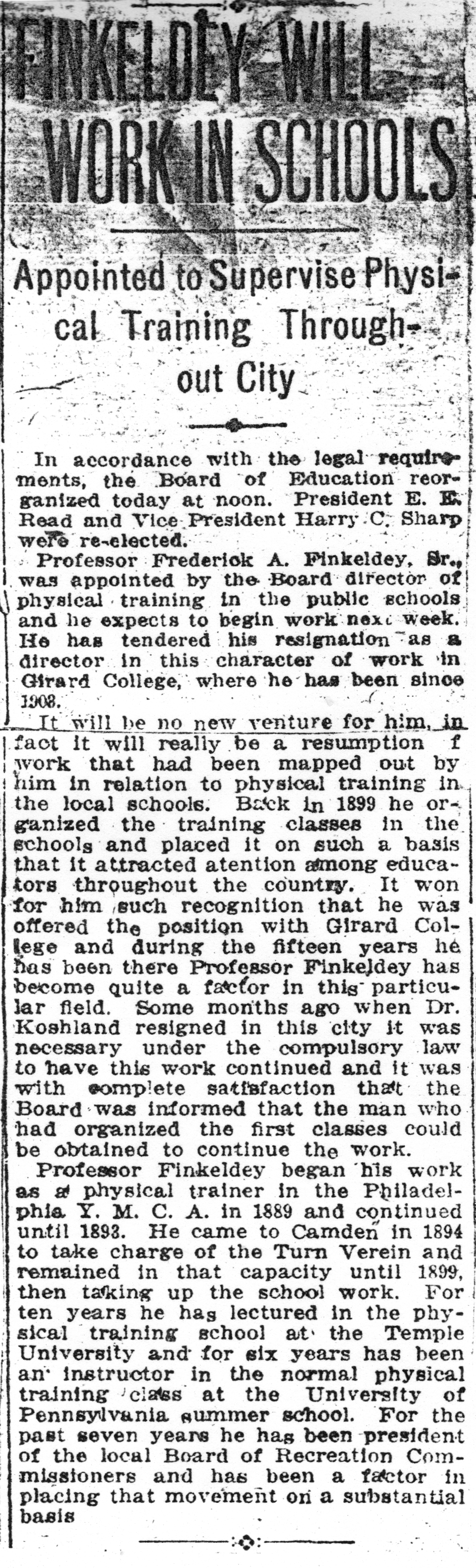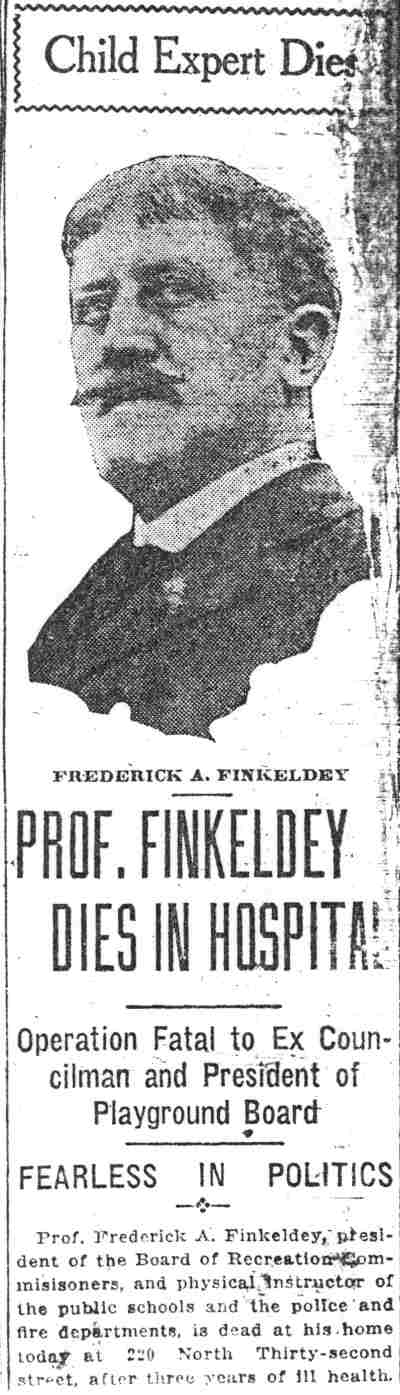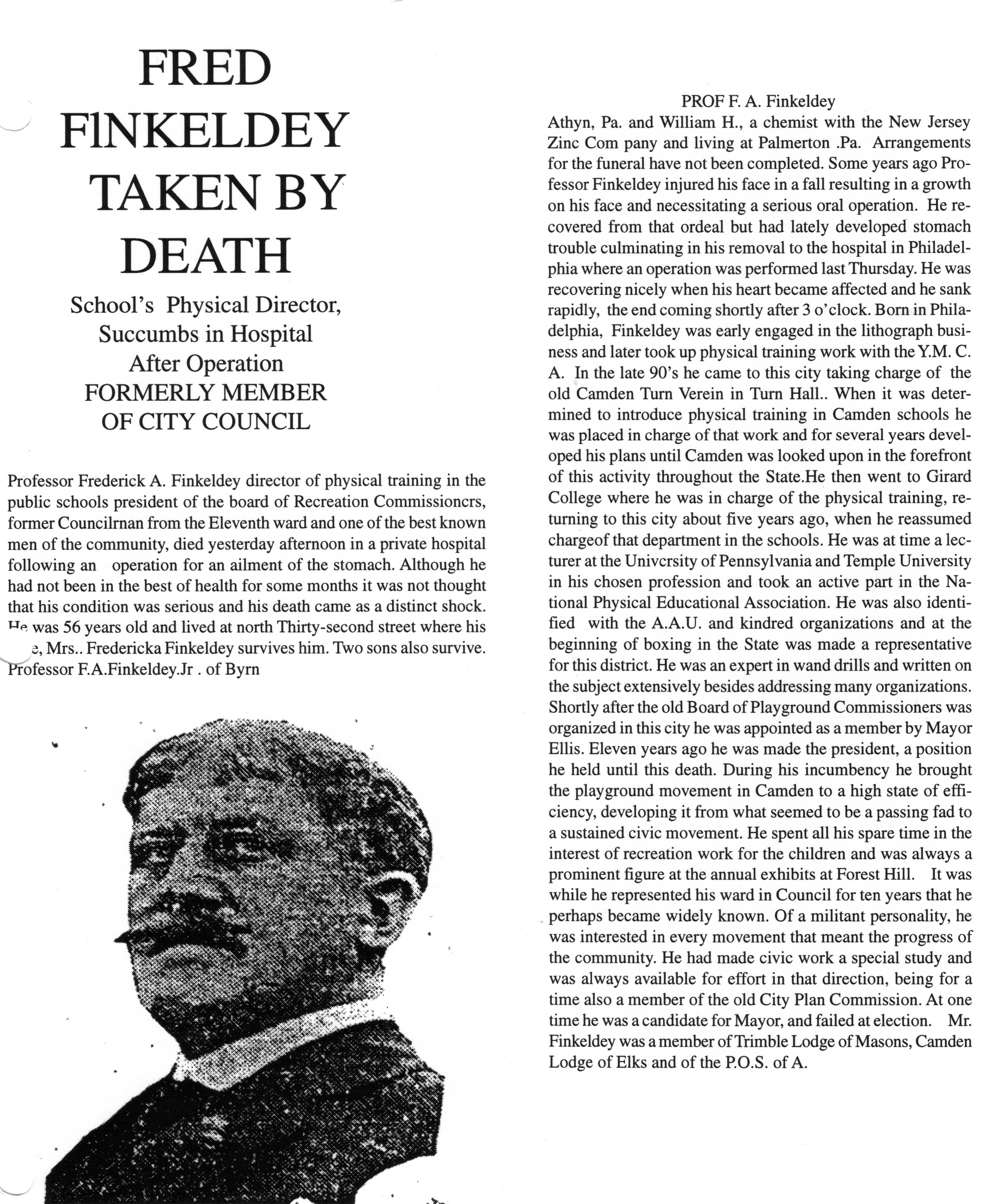 FREDERICK A. FINKELDEY was born on September 8, 1860 in Philadelphia to Johann Friedrich (John F.) Finkeldey and Louisa F. Birkenhauer. His father had emigrated from Germany in 1839 and was a lithographer and printer in Philadelphia. After his father's death in 1883, Fred and his brother Werner continued the family business at 218 Walnut Street, Philadelphia until 1896, and Fred had artistic talent. Frederick Finkeldey had planned to become a Lutheran minister, but developed tuberculosis and became interested in gymnastics and calisthenics. He attended a gymnastics program in Milwaukee, and in 1905 received a degree from Temple University in Philadelphia. In the 1890s, he became a physical education teacher in the Camden, New Jersey school system. In 1903 he left the Camden schools to become Director of Physical Education at Girard College, in Philadelphia, and worked there until 1918. He then returned to employment in Camden as Director of Physical Education. He established the playground system in Camden, and was founding member and trustee of the East End Trust bank on Federal Street. A staunch Republican, he was a member of the Camden City Council for many years, and served as Council president in 1914. In 1907 was an unsuccessful primary campaign for Mayor against Charles H. Ellis, but quickly mended fences with the Mayor, and went on to be a significant figure in city politics. Frederick Finkeldey brought his family to Camden in the 1890s when he was placed in charge of Turner Hall, which stood in the 500 block of Pine Street. Frederick Finkeldey was a member of the Turn Verein, also known as Turners, a German-American social organization that placed a great emphasis on athleticism and physical fitness. City Directories from 1894 through 1899 indicate that they lived at 554 Spruce Street from 1894 through 1899, and they were still at that address when the Census was taken in June of 1900. Directories from 1901 through 1905 show that the family had moved to 232 North 32nd Street in East Camden. The Finkeldeys remained at that address until moving into a newly built home at 220 North 32nd Street in 1906. This would be Frederick Finkeldey's home until his death in 1921. At the time of his death he was described as "Dynamic, Energetic. Advocated and fought for better civil government. Was popularly known as "The Man Who Can't Be Bossed." For the last ten years of his life devoted himself with a zeal that was almost a passion to the recreation and playground movement for young children." Frederick married Fredericka Meine (1863-1935) on August 27, 1888 at St. Peter's Episcopal Church in Philadelphia. They had two sons, Frederick Adam (1889-1944) and William Henry (1892-1974). Besides