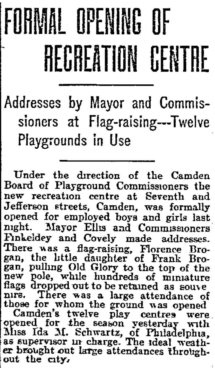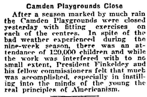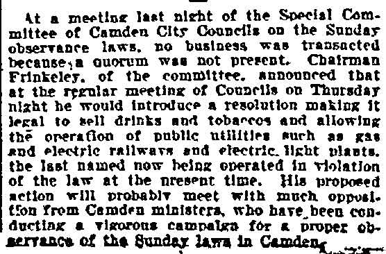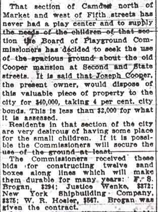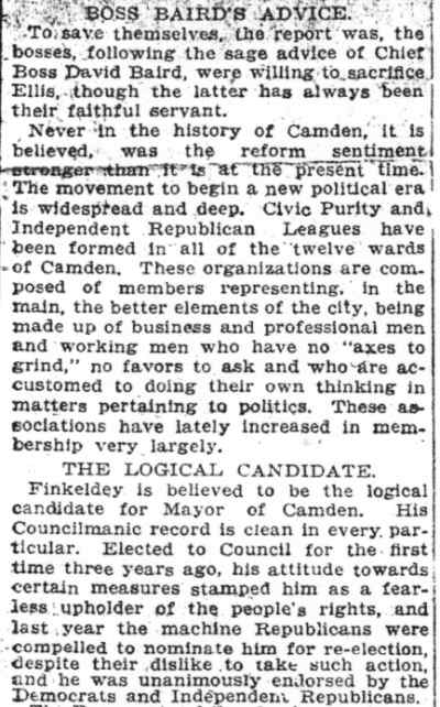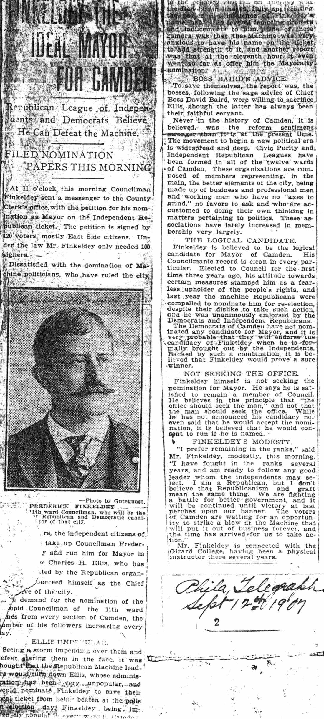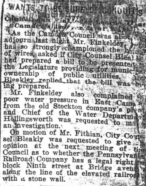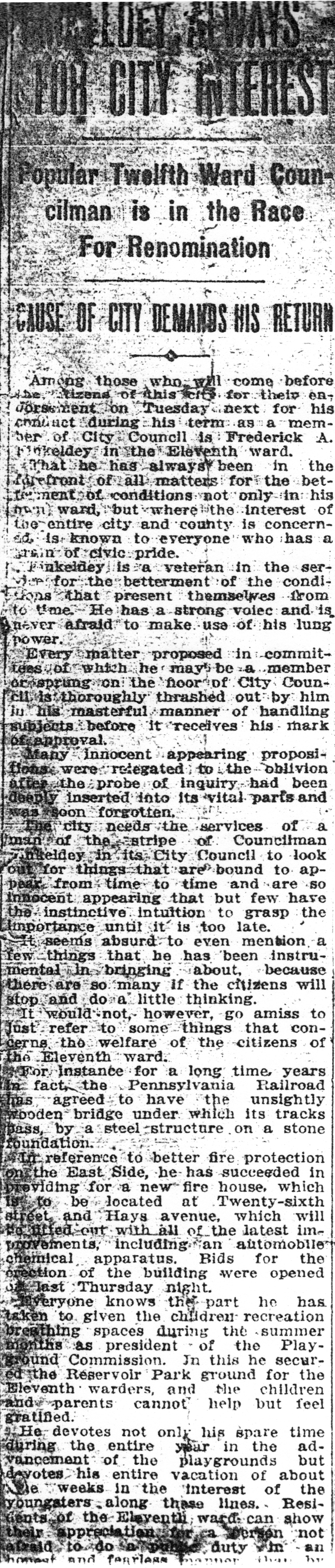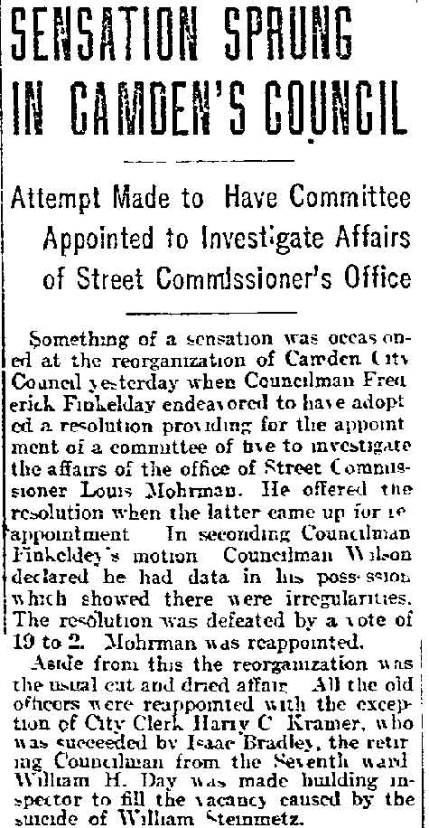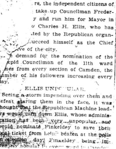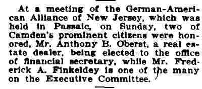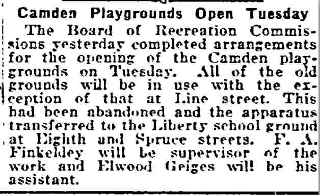 FREDERICK A. FINKELDEY was born on September 8, 1860 in Philadelphia to Johann Friedrich (John F.) Finkeldey and Louisa F. Birkenhauer. His father had emigrated from Germany in 1839 and was a lithographer and printer in Philadelphia. After his father's death in 1883, Fred and his brother Werner continued the family business at 218 Walnut Street, Philadelphia until 1896, and Fred had artistic talent. Frederick Finkeldey had planned to become a Lutheran minister, but developed tuberculosis and became interested in gymnastics and calisthenics. He attended a gymnastics program in Milwaukee, and in 1905 received a degree from Temple University in Philadelphia. In the 1890s, he became a physical education teacher in the Camden, New Jersey school system. In 1903 he left the Camden schools to become Director of Physical Education at Girard College, in Philadelphia, and worked there until 1918. He then returned to employment in Camden as Director of Physical Education. He established the playground system in Camden, and was founding member and trustee of the East End Trust bank on Federal Street. A staunch Republican, he was a member of the Camden City Council for many years, and served as Council president in 1914. In 1907 was an unsuccessful primary campaign for Mayor against Charles H. Ellis, but quickly mended fences with the Mayor, and went on to be a significant figure in city politics. Frederick Finkeldey brought his family to Camden in the 1890s when he was placed in charge of Turner Hall, which stood in the 500 block of Pine Street. Frederick Finkeldey was a member of the Turn Verein, also known as Turners, a German-American social organization that placed a great emphasis on athleticism and physical fitness. City Directories from 1894 through 1899 indicate that they lived at 554 Spruce Street from 1894 through 1899, and they were still at that address when the Census was taken in June of 1900. Directories from 1901 through 1905 show that the family had moved to 232 North 32nd Street in East Camden. The Finkeldeys remained at that address until moving into a newly built home at 220 North 32nd Street in 1906. This would be Frederick Finkeldey's home until his death in 1921. At the time of his death he was described as "Dynamic, Energetic. Advocated and fought for better civil government. Was popularly known as "The Man Who Can't Be Bossed." For the last ten years of his life devoted himself with a zeal that was almost a passion to the recreation and playground movement for young children." Frederick married Fredericka Meine (1863-1935) on August 27, 1888 at St. Peter's Episcopal Church in Philadelphia. They had two sons, Frederick Adam (1889-1944) and William Henry (1892-1974). Besides