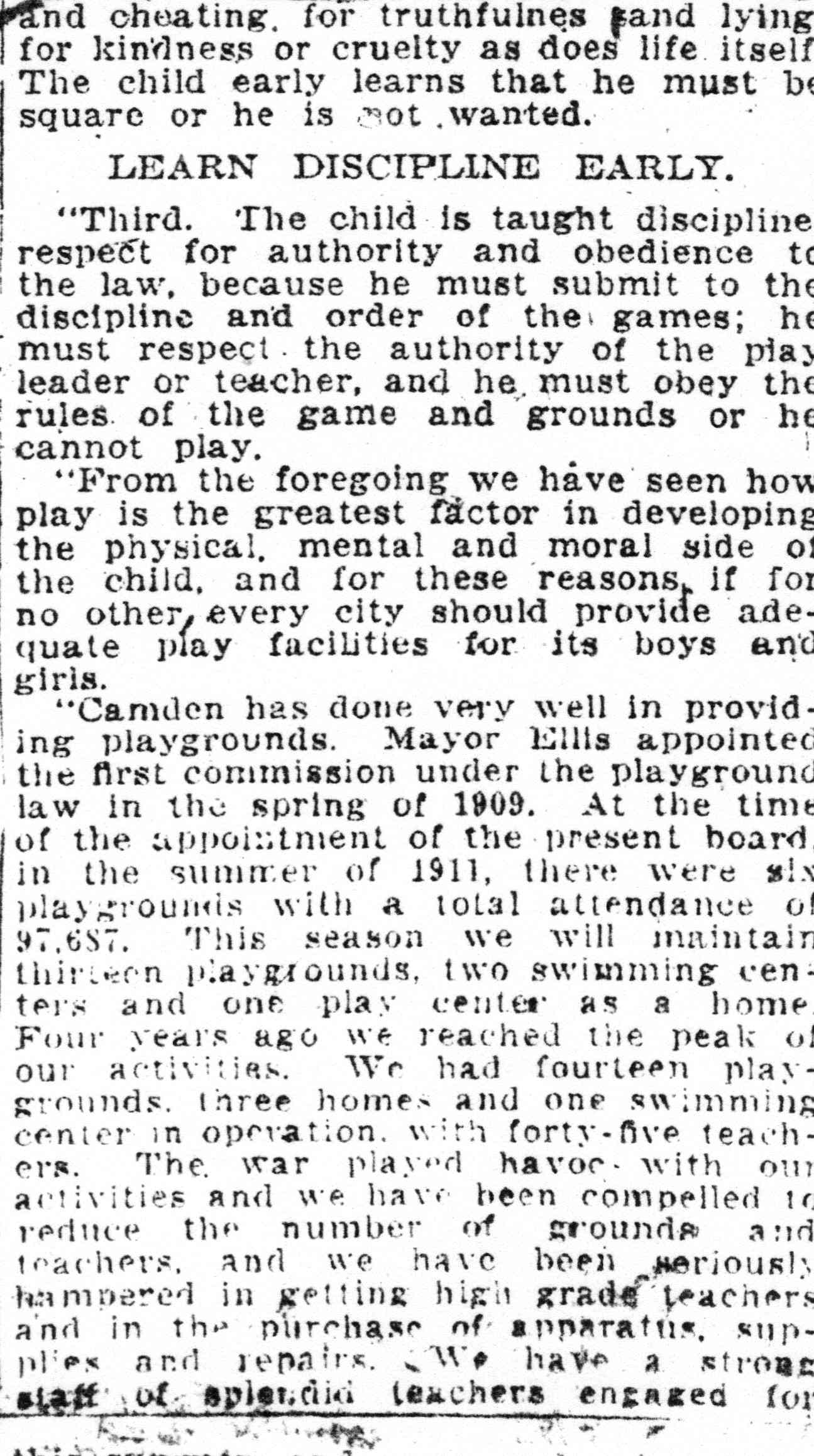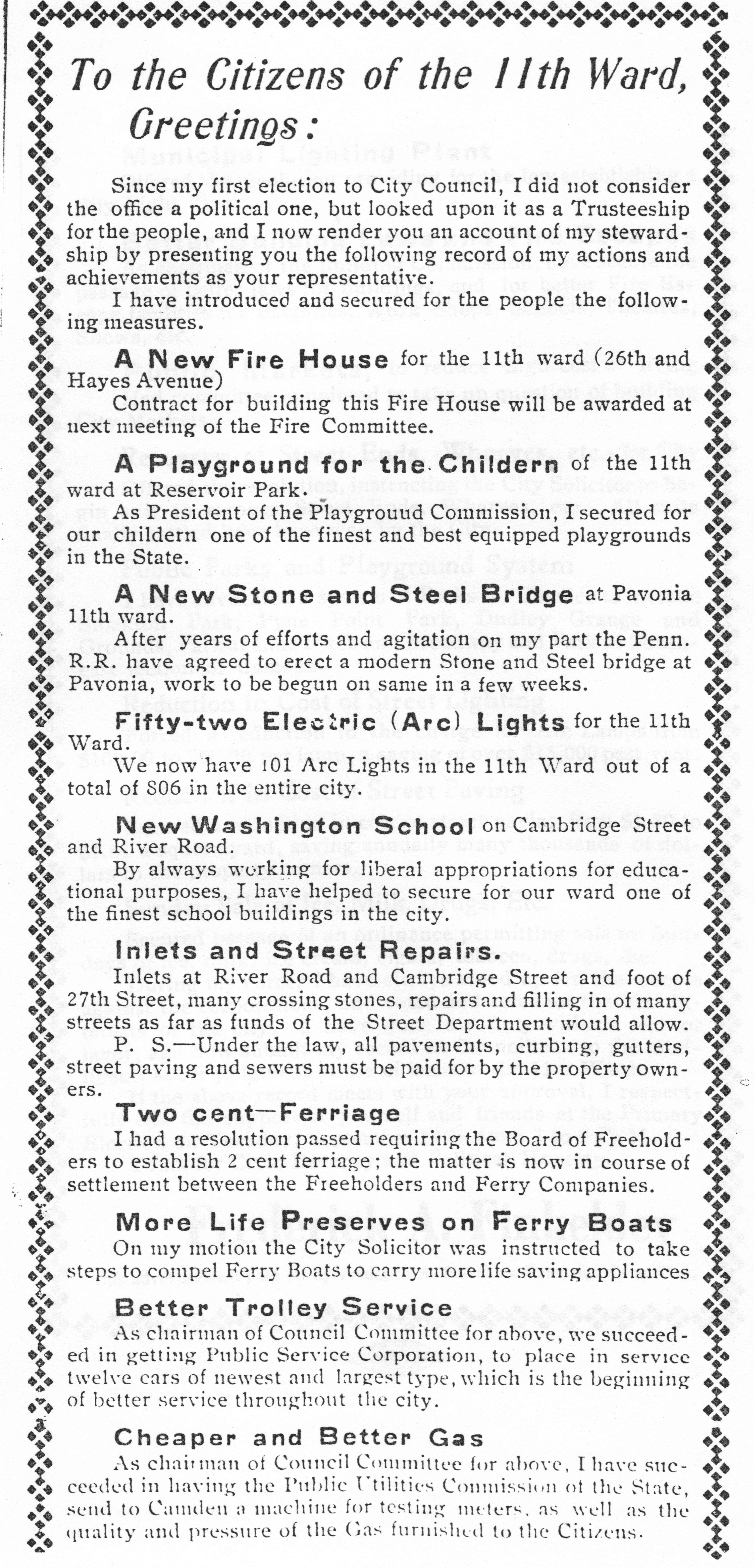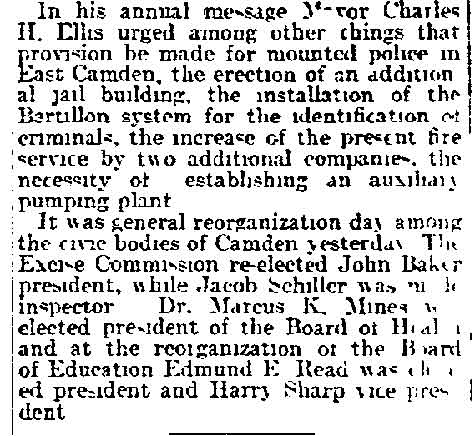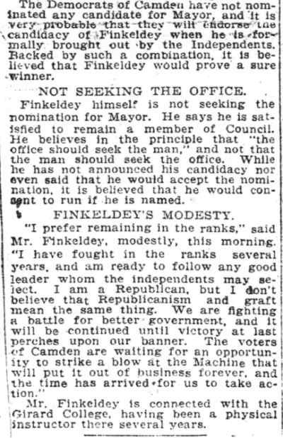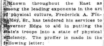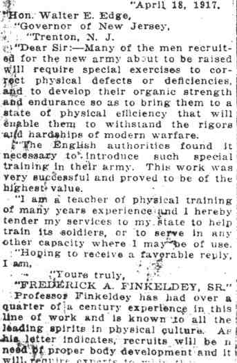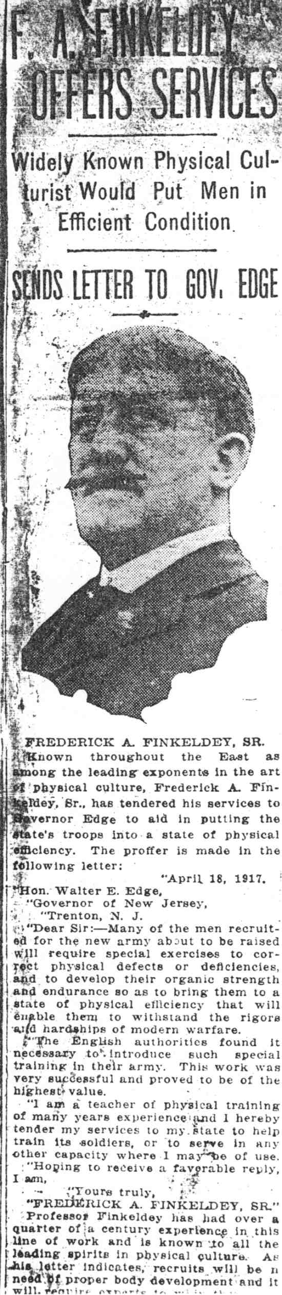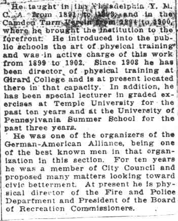 FREDERICK ADOLPH FINKELDEY Few public men of Southern New Jersey have been so greatly loved and admired by constituents and few have left behind them so brilliant a record of achievement in behalf of their public as Frederick Adolph Finkeldey. While his activities as a member of the Camden City Council and of the City Planning Commission and as president of the Board of Recreation Commissioners have made him well known to the people of his city, he is nationally known as an authority on the physical education of school children, and as a champion of the playground movement in America. H is work in Camden as director of physical training in the Camden Public Schools and in the police and fire departments and in Philadelphia as director of physical training at Girard College and as an instructor in physical education at the University of Pennsylvania, and at Temple University, has gained for him an enviable reputation in this his chosen profession. Frederick Adolph Finkeldey was born in Philadelphia, in the old Finkeldey home at Juniper and Pine streets, on September 8, 1861. His father, John Frederick Finke1dcy, was born in Frankenberg. Hessen. Germany, on September 8, 1821. He came to America in 1838, His first home in this country was in Baltimore, Maryland. Later he moved to Philadelphia, where on January 1, 1858, he married Louisa Fredricka Birckenhauer. The children were: Frederick Adolph, Louisa, Anna, and Werner. Adolph Finkeldey was a graduate of Temple University, graduating in 1905 in Physical Education. His pedagogical course of training was obtained in the Milwaukee (Wisconsin) Normal School. Preparation for his life-work began with his studies with the North American Gymnastic Union, from which he graduated in 1890. From 1889 to 1891, while still a student, he taught physical training at the Rugby Academy, in Philadelphia, and from 1891 to 1894 he was physic al instructor at the Philadelphia Young Men's Christian Association. The following six years were spent in directing the physical culture activities of the Camden Turn Verein. In 1900 he was made physical director of the Camden Public Schools. His fine, erect presence upon entering the schoolroom, his unfailing courtesy and the atmosphere of friendly humor he created endeared him to teachers and pupils alike. His efficient outlines of work for the schools were intelligently planned to meet the needs of the growing child, and the splendid results obtained there from in the physical well-being of hundreds of children form a lasting monument to the memory of this truly great teacher. In 1904 he accepted the position of director of physical training at Girard College, at which post he served until 1915 when, to the deep satisfaction of hosts of friends, he returned to the Camden Public Schools, where he continued to work until a few days before his untimely death on October 24, 1921. Mr. Finkeldey's public career began in 1905, when he was elected a member of the Camden City Council from the Eleventh Ward in which he lived most of his life. He served on the city council until 1915. From 1913 to 1921 he was president of the Board of Recreation Commissioners of the city of Camden, and for years served on the City Planning Commission. Mr. Finkeldey became famous for his work in the Camden City Council. A witty, terse speaker of convincing eloquence, his humor colored many a political argument. A vigorous agitator in behalf of the citizens of Camden and an opponent of cliques, political machines and grafters, Mr. Finkeldey waged a lifelong battle against unscrupulous, self-interested political groups. It was through his efforts that the railroad was forced to erect a modern stone and steel bridge at Pavonia; he fought for and won a playground for children in Reservoir Park, Camden; he secured the passage of an ordinance providing electric arc lights for the Eleventh Ward. He was instrumental in acquiring a large area to be set aside as an athletic field for the use of the school children of Camden. He was also the prime figure in the fight to get two-cent ferry rates across the river from Camden to Philadelphia, and the leader in the movement that brought about the erection of the public markets. It was partly due to his efforts that street lighting and paving costs were reduced. He also secured the passage of the ordinance permitting in Camden, the sale of ice, milk, drugs, and other necessities on Sunday. For these many services to the public, and his activities against sinister political cliques. Mr. Finkeldey came to be much loved and respected. He was the sort of man who not only through his immutable integrity and public interest, refused to accept graft from schemers, but went further and disclosed the operations and the machinations of the grafters. Thus he died, a man of little material wealth, though opulent in public affection and esteem. Mr. Finkeldey was a director in the East End Trust Company, and in the Westfield Building and Loan Association. He was a member of the Young Men's Christian Association; of Trimble Lodge No. 117, of the Free and Accepted Masons, of Camden; the Camden Lodge, No. 293 of the Benevolent and Protective Order of Elks; the Patriotic Order of the Sons of America, the American Playground Association, the New Jersey State Physical Education Association, of which he was a member from March 4, 1898, to the date of his death; the American Association for the Advancement of Physical Education, and the Camden Teachers' Club. He was a devout believer in the Bible, at one time in his early youth having begun studies preliminary to those leading to the ministry. Mr. Finkeldey married Fredericka Meine, daughter of William G. and Eliese (Casche) Meine, in St. Peter's Protestant Episcopal Church, on Third and Pine Streets, Philadelphia, on August 27, 1888. There are two sons: Frederick Adam, born December 6, 1889; and William Henry, born May 26, 1892. Both are married and each has three children. |