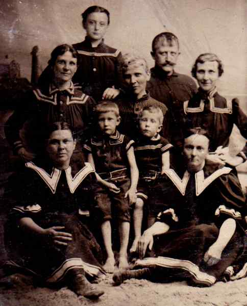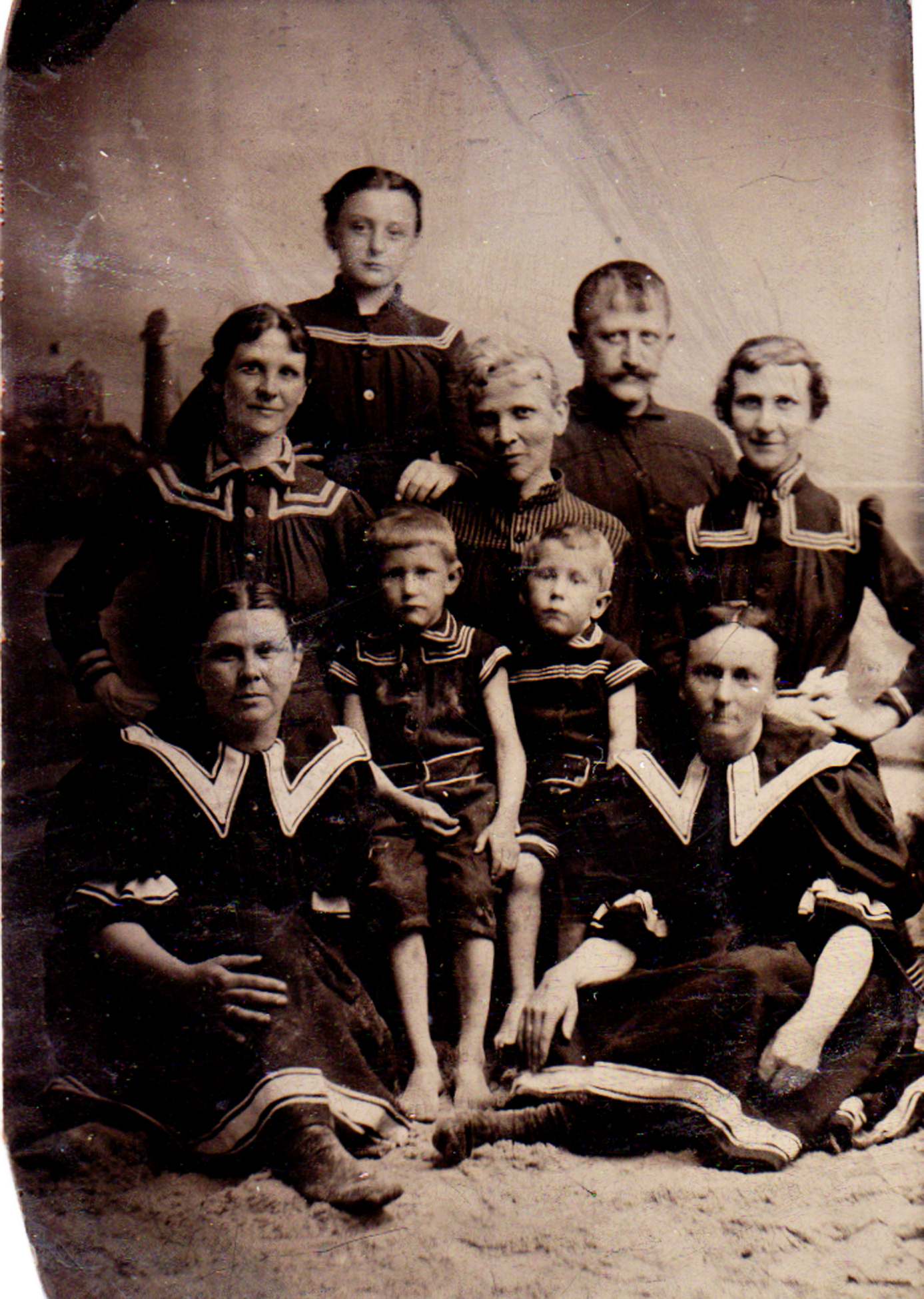 1896 photo of Frederick Finkeldey (back row) and Fredericka (front left), their two young sons William and Fred Jr. and five unidentified persons |