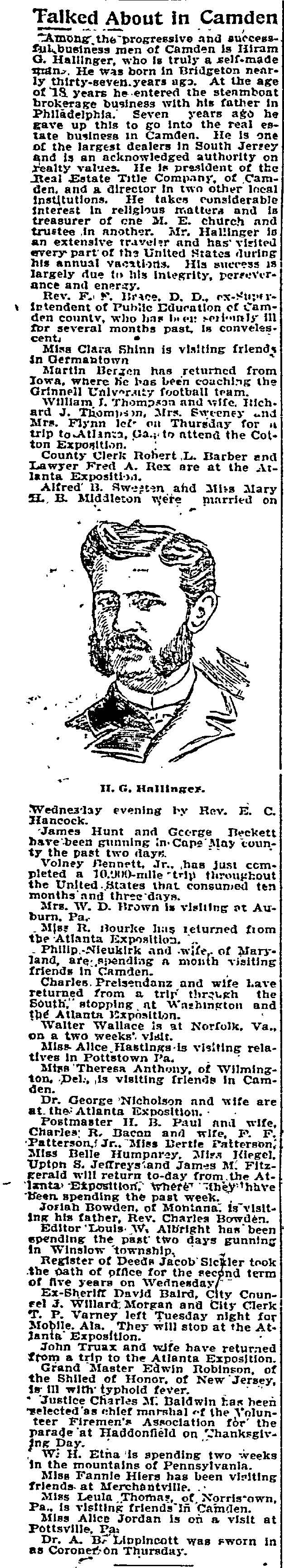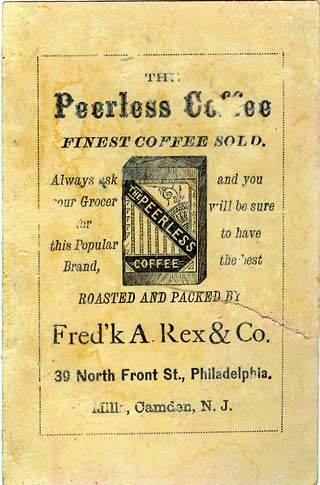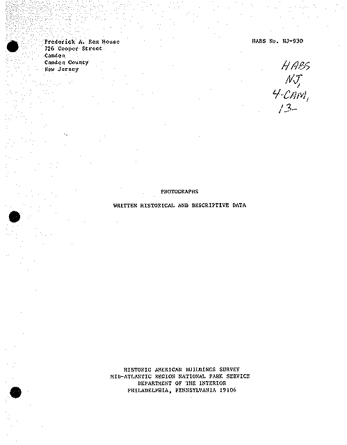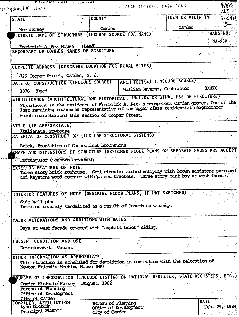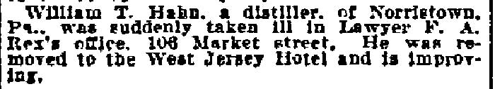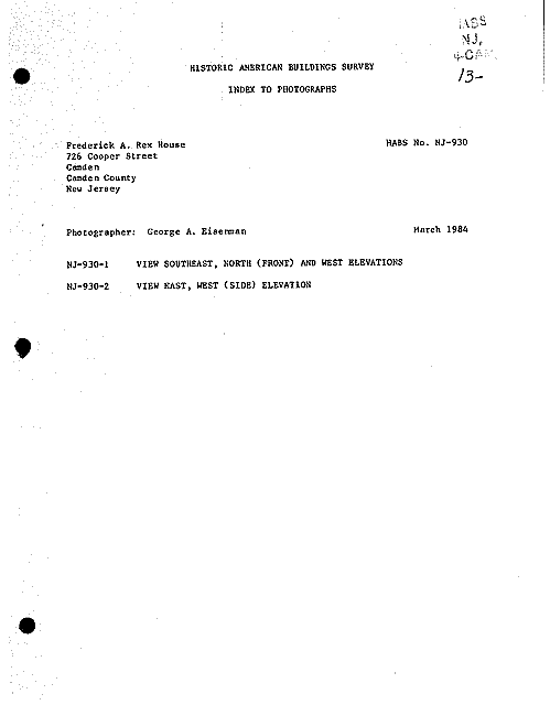 FREDERICK A. REX was born in March of 1850 in Pennsylvania, one of at least seven children born to John and Sarah Rex. His father owned a large farm in Whitpain Township, Montgomery County, Pennsylvania at the time of the 1850 Census. When the Census was taken in 1870 Frederick Rex was working as bank clerk and living ion Camden NJ. He subsequently went into the practice of law. Frederick A. Rex was not then married. The following year he helped found the Trimble Lodge No. 117, Free and Accepted Masons. He would wed M. Louise Fewsmith around 1877, a son, William, was born in December of that year. Daughter Elizabeth was born in late 1880. During the 1870s Frederick Rex also served as an officer with the Sixth Regiment, New Jersey National Guard. Frederick A. Rex was a member of the First Presbyterian Church of Camden, where many other men prominent in the business and civic life of Camden attended, includi ng Albert W. Markley, John F. Starr, Peter L. Voorhees, Charles Stockham, Christopher A. Bergen, Randal E. Morgan L.T. Derousse, Charles Danenhower, Dr. James A. Armstrong, M.D., and Dr. J.V. Schenck, M.D. At the time of the 1 880 Census Frederick Rex and family lived at 726 Cooper Street. They moved to 533 Penn Street later in the decade, and lived there through 1890. Neighbors included F. Wayland Ayer and Richard Fetters Smith. During these years Frederick A. Rex was quite busy in both business and civic circles. Besides his law practice, he owned a coffee and Tea businesses with an office at 20 Market Street and in Philadelphia. He also served as clerk in Camden's District Court, and as treasurer of the Board of Education. In 1895 Mrs. Louisa Rex was a charter member of the Woman’s Club of Camden. Frederick A. Rex had moved to Merchantville by the summer of 1900, residing at 6 Clifton Avenue. The family was still there in 1910. He later took ill, and spent his last days in a South Jersey sanitarium. Frederick A. Rex died on July 17, 1916. |