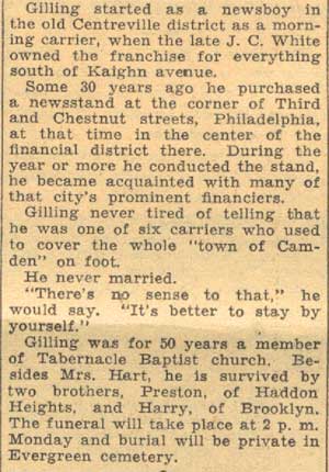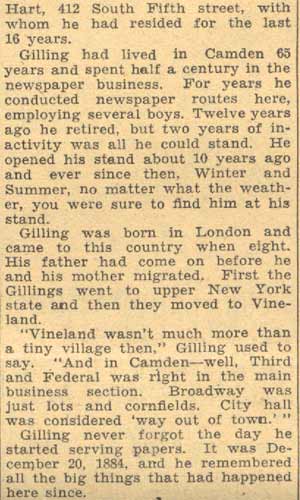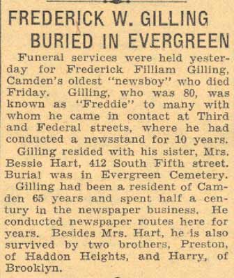 FREDERICK WILLIAM "FREDDIE" GILLING was born in England in 1854 to William and Louisa Gilling. His family came to the United States when he was 8. After spending some time in upstate New York, the Gilling family moved to Vineland NJ. William E. Gilling fought on the side of the Union durung the Civil War, and after moving to Camden around 1869, was a member of the Thomas M.K. Lee Post No. 5 of the Grand Army of the Republic. By 1880 the William Gilling family was living at 432 Jasper Street, where they would remain into the 1890s. Freddie Gilling began delivering newspapers in the Centerville section of Camden, not far from his home, in December of 1884. He would spend the rest of his life employed in selling newspapers. For several years he conducted paper delivery routes, employing several boys. In the 1900s he purchased a news stand at South 3rd and Chestnut Streets in Philadelphia, and became acquainted with many members of Philadelphia's banking community. When the Census was taken in January of 1922, Freddie Gilling was living with his widowed sister, Mrs. Bessie Hart. She had been married to Camden Police Department detective William D. Hart. Freddie Gilling retired in 1922, but after two years of inactivity, he purchased another news stand, this one at 3rd and Federal Streets in Camden, where he became well known to many in Camden. He worked right up until 10 days before his death on May 11, 1934. A member of Tabernacle Baptist Church of Camden for over fifty years, Freddie Gilling was buried at Evergreen Cemetery in Camden NJ . |