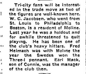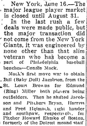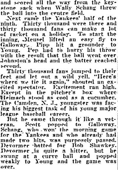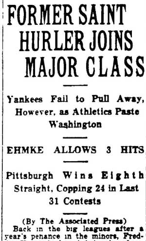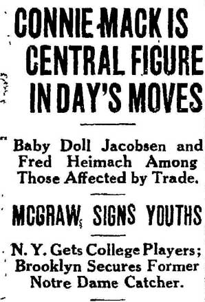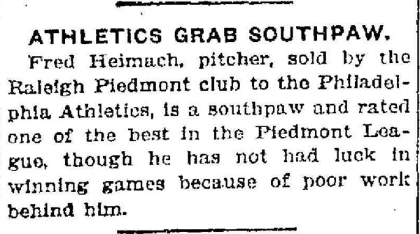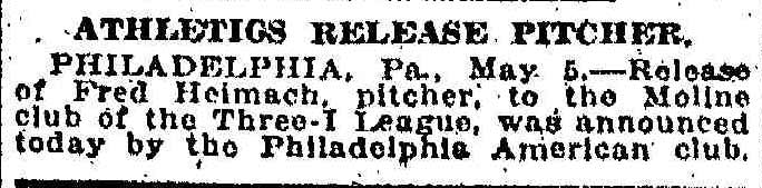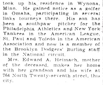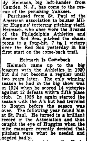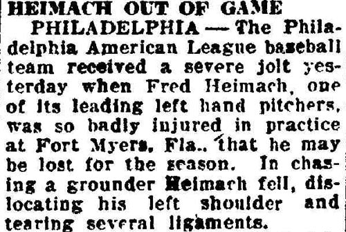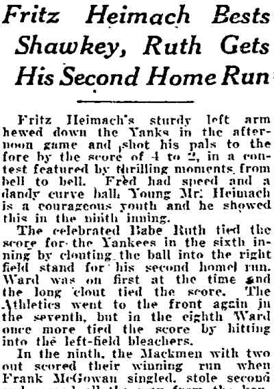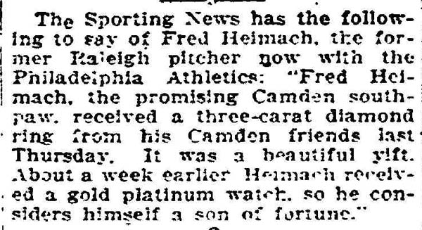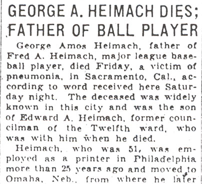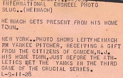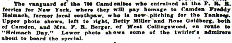764 North 27th Street, where he lived with wife Esther, daughter Margaret, his mother, an aunt and a niece. Fred Heimach's family later had an oyster house at North 27th Street and Hayes Avenue. Known as "Lefty", he was well-known in the neighborhood an also at Camden High School as a skilled baseball player and as a fine pitcher. He attracted the attention of Connie Mack and after being discharged from his military duties took up professional baseball. After pitching well for the Raleigh Nats of the Piedmont League, he was purchased by the Philadelphia Athletics on September 6, 1920. Just 19 years of age, he made his big league debut before the end of the 1920 major league season. He spent 1921 with the Moline (Iowa) Plowboys of the Illinois-Indian-Iowa (Three-I) League where he played under Earle Mack. The Plowboys won the pennant that year. After making one appearance with the Athletics in 1921, Fred Heimach returned to the big club in 1922 and soon established himself as a good pitcher and a dangerous hitter. A spring training injury cost him most of the 1925 season. Coming back in 1926, he was off to good start with the Philadelphia Athletics when, on June 15, 1926, when he was traded by along with Slim Harriss and Baby Doll Jacobson to the Boston Red Sox for Tom Jenkins and Howard Ehmke. The Red Sox were terrible, losing 107 games, while Ehmke helped take to Athletics to the World Series and World Championship in 1929, starting the first and last games of the series. Fred Heimach played with St. Paul in the American Association in 1927. He started the 1928 season with St. Paul and had won 16 games by mid-July. The New York Yankees, though a team loaded with no less than eight future Hall of Fame players, including Babe Ruth and Lou Gehrig, and a future Hall of Famer as its manager, Miller Huggins, were in a close race with the Philadelphia Athletics. The Yankees purchased Fred Heimachs contract from St. Paul and he was back in the big leagues. In his first start with the Yankees Fred Heimach threw a four-hit shutout against the Boston Red Sox. He finished the year with a record of two wins and three losses and an earned run average of 3.31 runs per nine innings pitched. The Yankees ultimately won the pennant and the World Series that season. One day that season while the Yankees were in Philadelphia, his teammate, Babe Ruth, was looking for a place to get a drink- not an easy task for out-of-towners in Prohibition-era Philadelphia. Fred Heimach brought the Babe over the river to Camden and his old Cramer Hill neighborhood. They stopped at Strahle's Tavern at North 26th Street and River Avenue, where the locals gave the visiting ballplayers an enthusiastic reception. Don Strahle, who's father was tending bar that night, writes "In the late 1920's there was a Cramer Hill neighbor who was a relief pitcher for the New York Yankees, Freddy Heimach. He came into the saloon one night about 10 o'clock when Henry was tending bar, bringing one of his teammates with him, Babe Ruth. There was pandemonium. Ruth wanted to buy everyone drinks, and everyone wanted to buy Ruth drinks." On September 11, 1928 the Camden County Chamber of Commerce organized a Fred Heimach Day at Shibe Park in Philadelphia, where the Yankees were facing the Athletics. Cramer Hill's Mathews-Purnell Post #518 of the Veterans of Foreign Wars presented Fred Heimach with a ring, and other gifts were tendered by his appreciative fans and friends, many of whom were in attendance.. Fred Heimach returned to the Yankees in 1929 as a starter and reliever, winning 11 games against six losses and saving four. On April 18 of that year, after two cancellations of their season start—their first ever—the Yankees opened against the Red Sox before 40,000 at the Stadium, winning 7–3. Judge Landis presents diamond-studded watches to the New York players in honor of their championship season in 1928. New York Starter George Pipgras allows just three hits in five 1/3 innings, but walks 9. Fred Heimach came in and pitched three 2/3 innings of hitless ball to preserve the win. In his first at bat against Boston's Red Ruffing, the newly wed Babe Ruth hit a home run and as he rounded second base, he doffed his cap to his bride Claire in the stands. Lou Gehrig added a home run in the sixth inning, off Milt Gaston. For the first time, the Yankees had numbers on their uniforms, assigned according to the player's spot in the lineup: Combs, 1, Koenig, two Ruth, 3, Gehrig, 4, Meusel, 5, Lazzeri 6, Durocher, 7, Grabowski, 8. The win went to Pipgras # 14, with Heimach #17 picking up the save. After opening 1930 in the minor leagues with the Toledo Mud Hens of the American Association, Fred Heimach returned to the majors with the Brooklyn Dodgers in July of 1930. He was with Brooklyn 1933. A broken ankle and other injuries limited his play to ten appearances. On September 1, 1933 the Dodgers released him. He finished with a record of 62 wins, 69 losses, and an earned run average of 4.46 runs per nine innings pitched. It must be said that save for his two seasons with the New York Yankees, the teams he played for were pretty bad. The 1925 Athletics finished second but still were 8-1/2 games out of first place, the 1931 and 1932 Dodgers were finished fourth both years, all the other teams Fred Heimach played for finished in the bottom half of the leagues played in. Besides his pitching, Fred Heimach also made a name for himself with a .385 average as a pinch hitter. He is one of only 20 pitchers to collect 20 hits as a pinch hitter. He also played six games at first base for the Philadelphia Athletics in 1922. Defensively, he was also excelled. His fielding skill made him a "fifth infielder," and when a broken ankle finished him in 1933, he had run up a string of errorless games that went back to 1926, covering 171 chances. Another interesting event in Fred Heimach's baseball career occurred in 1922 when he was utilized as a courtesy runner. For a ti