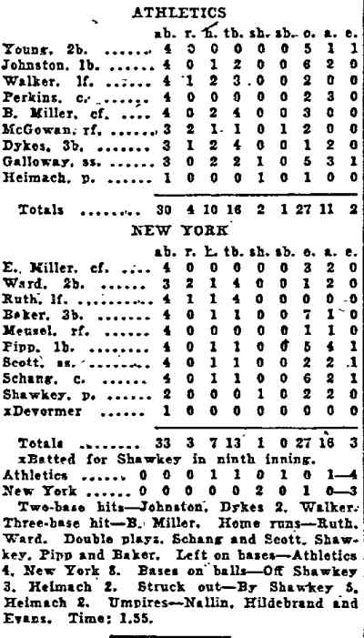 Year Ag Tm Lg G AB R H 2B 3B HR RBI SB CS BB SO BA OBP SLG *OPS+ TB SH SF IBB HBP GDP +--------------+---+----+----+----+---+--+---+----+---+--+---+---+-----+-----+-----+----+----+---+---+---+---+---+ 1920 19 pha AL 1 1 0 0 0 0 0 0 0 0 0 0 .000 .000 .000 -100 0 0 0 1921 20 pha AL 1 4 0 1 0 0 0 1 0 0 0 1 .250 .250 .250 28 1 0 0 1922 21 pha AL 37 60 6 15 3 1 0 7 1 0 5 12 .250 .308 .333 65 20 3 0 1923 22 pha AL 63 118 14 30 4 1 1 11 0 0 4 18 .254 .279 .331 59 39 5 0 1924 23 pha AL 58 90 14 29 3 2 0 12 1 0 3 8 .322 .344 .400 91 36 3 0 1925 24 pha AL 15 6 3 1 0 0 0 0 0 0 0 2 .167 .167 .167 -18 1 0 0 1926 25 TOT AL 40 54 2 14 1 0 0 4 0 0 3 13 .259 .298 .278 52 15 1 0 pha AL 14 10 0 1 1 0 0 1 0 0 0 4 .100 .100 .200 -25 2 0 0 bos AL 26 44 2 13 0 0 0 3 0 0 3 9 .295 .340 .295 69 13 1 0 1928 27 nyy AL 18 30 2 5 0 0 0 2 0 0 2 6 .167 .219 .167 4 5 1 0 1929 28 nyy AL 36 49 5 9 2 0 1 2 0 0 3 12 .184 .231 .286 36 14 0 0 1930 29 bro NL 13 4 0 1 0 0 0 0 0 0 1 .250 .250 .250 22 1 0 0 1931 30 bro NL 39 61 3 12 0 1 0 5 0 4 7 .197 .246 .230 29 14 0 0 1932 31 bro NL 37 55 9 9 2 0 1 4 0 4 18 .164 .220 .255 28 14 3 0 1933 32 bro NL 10 10 0 2 0 0 0 1 0 0 0 .200 .200 .200 16 2 0 0 1 +--------------+---+----+----+----+---+--+---+----+---+--+---+---+-----+-----+-----+----+----+---+---+---+---+---+ 13 Seasons 368 542 58 128 15 5 3 49 2 0 28 98 .236 .274 .299 50 162 16 0 0 0 1 +--------------+---+----+----+----+---+--+---+----+---+--+---+---+-----+-----+-----+----+----+---+---+---+---+---+ 162 Game Avg 239 26 56 7 2 1 22 1 0 12 43 .236 .274 .299 50 71 7 0 0 0 0 Career High 63 118 14 30 4 2 1 12 1 0 5 18 39 5 0 0 0 1 +--------------+---+----+----+----+---+--+---+----+---+--+---+---+-----+-----+-----+----+----+---+---+---+---+---+ Year Ag Tm Lg G AB R H 2B 3B HR RBI SB CS BB SO BA OBP SLG *OPS+ TB SH SF IBB HBP GDP