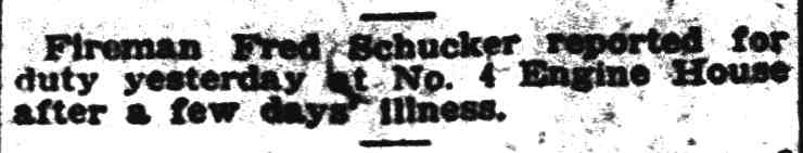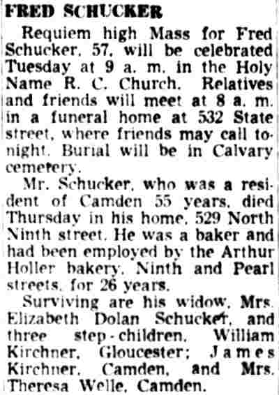 FREDERICK SCHUCKER was born on August 20, 1895 in Philadelphia PA, the son of Philip and Mary Schucker. The family had moved to Camden in the 1890s, and were living at 527 Borton Street when the Census was taken in 1900. By 1917 the family was living at 935 Pearl Street in Camden NJ. On April 5, 1917 Frederick and older brother William Schucker registered for the draft in Camden. Frederick was then working as a baker and William was working as a bookbinder. Shortly thereafter William was appointed to the Camden Fire Department. William was drafted in February of 1918. He went overseas as a member of the Machine Gun Company, 309th Infantry Regiment. and was killed in action in France on October 16, 1918 during the Battle of the Argonne Forest. Fred Schucker also served over seas and was wounded in action. He returned to Camden after the war and received an appointment to the Camden Fire Department in 1920. He began working as a firefighter on January 1, 1921 at Engine Company 4 and was still a member of the department as late as August of 1925. In the latter part of 1925 Fred Schucker left the Fire Department and went back to work as a baker, taking a position with the Arthur Holler bakery at North 9th Street and Pearl Street. He remained with the Holler bakery for the rest of his working days. In 1936 Fred Schucker lived at 719 North 8th Street. When he passed away his address was 529 North 9th Street. . |