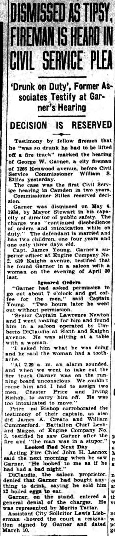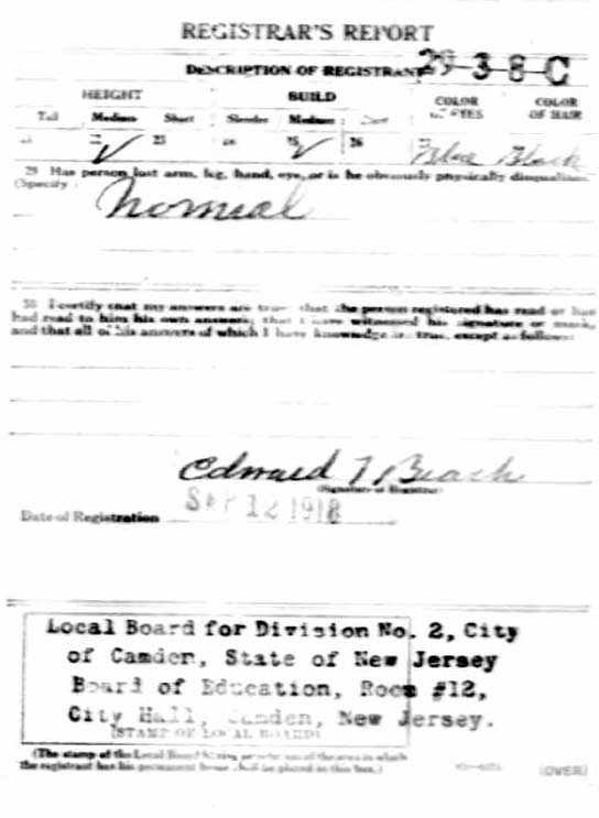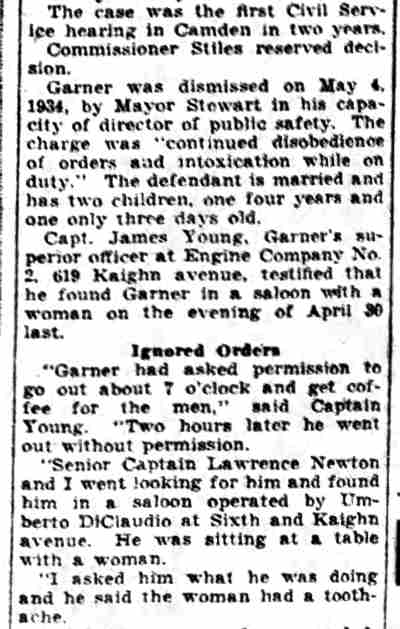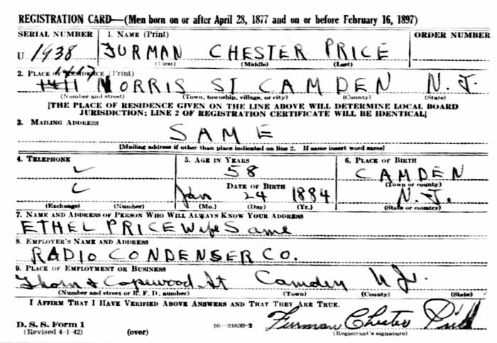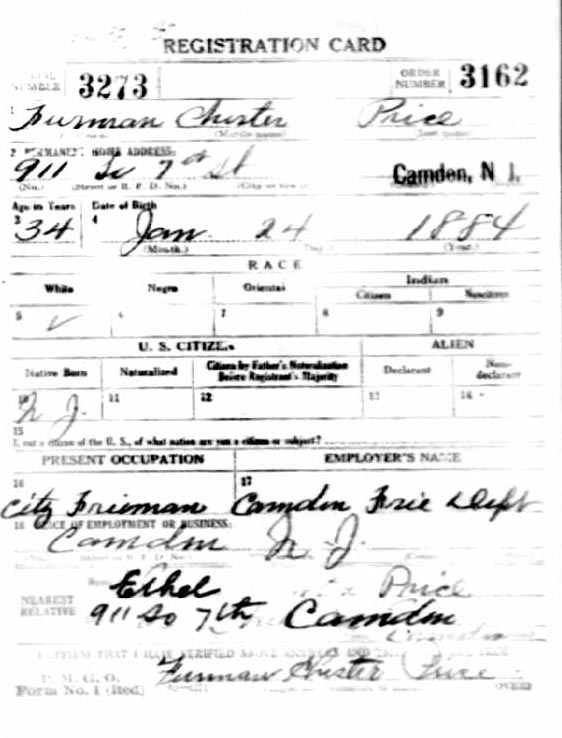 FURMAN CHESTER PRICE was born on January 24, 1884 to Isaac N. and Annie Price. He was an only child. The 1898 and 1899 City Directories list the family at 783 Spruce Street. The 1900 and 1910 Census shows Furman C. Price living with his parents at 637 Cherrier Place. He was working as a "helper" in 1900 and as a pipefitter in 1910. By 1914 he had married. The 1914 City Directory shows him and his wife Ethel at 911 South 7th Street. He was still at that address when he registered for the draft in September of 1918. Furman C. Price was appointed to the Camden Fire Department on December 1, 1916, taking the place of William McCauley. The 1924 City Directory and the April 1930 Federal Census shows Furman Price, his wife Ethel living at 725 Spruce Street. Furman Price was still working as a member of the Camden Fire Department at the time of the Census, and his father was also living with him. Camden Fire Department records from 1931 also show him living at the Spruce Street address. He left the department on pension at some point during the 1930s, eventually finding work with the Radio Condenser Company at their plant at Thorn Street at Copewood Street. The 1940 City Directory shows him living at 1411 Norris Street. He was still at that address in the spring of 1942 when he registered for the draft, but moved to 1417 Norris shortly thereafter, and was still at that address when the 1946 City Directory was compiled. Furman C. Price passed away in April of 1964. |
