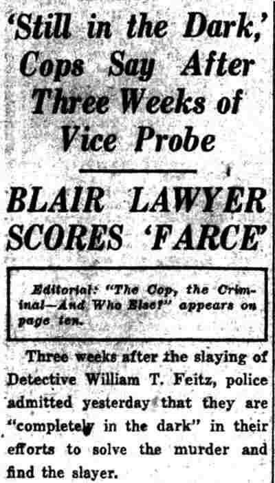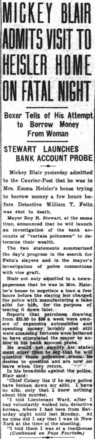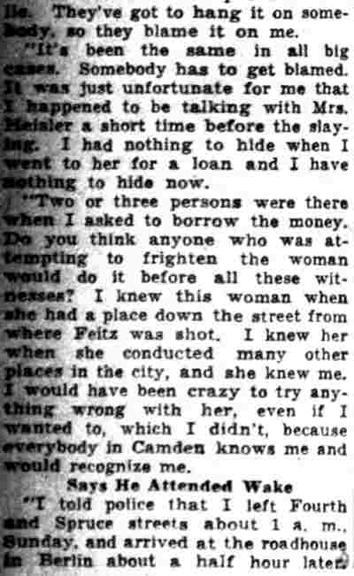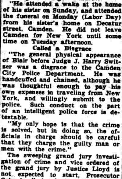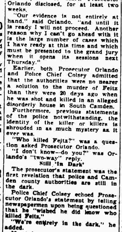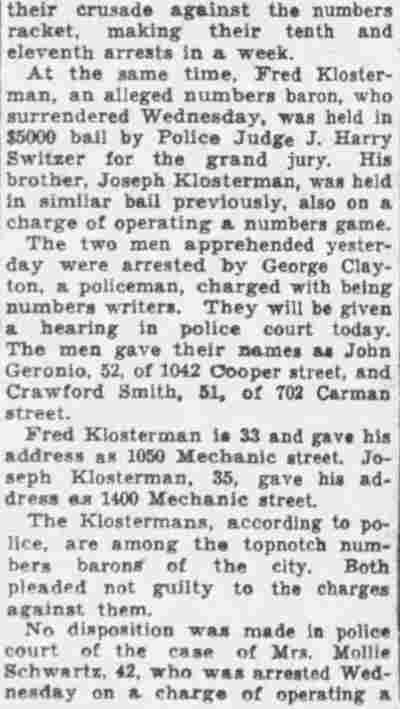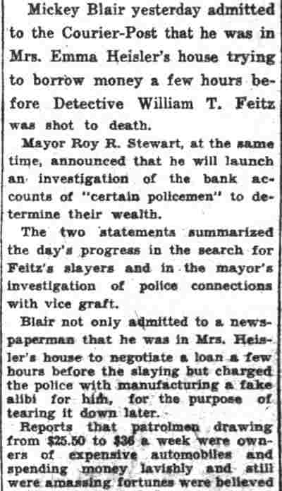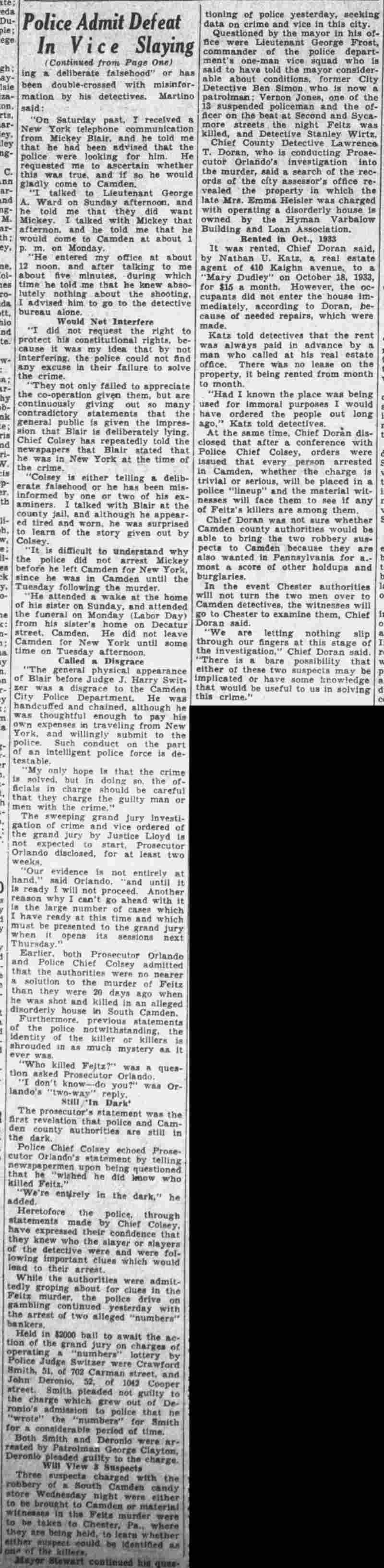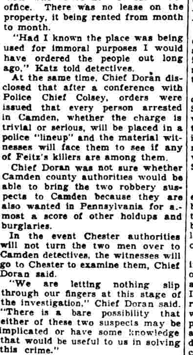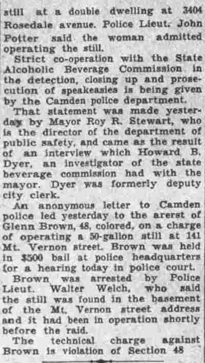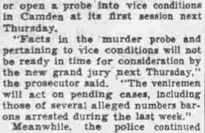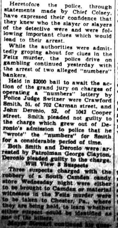 HERE IN NUMBERS QUIZ Arrests in the numbers racket in Camden continued today simultaneously with the continuation of the inquiry into the murder of City Detective William T. Feitz Jr. With the Feitz slaying probe in its eleventh day- the detective was slain September 2 at 243 Sycamore Street, an alleged disorderly house- city and county authorities were still questioning witnesses in an endeavor to obtain sufficient evidence to name the murderer or murderers. The arrest this morning of Crawford Smith, 51, of 702 Carman Street, as a numbers writer, brought the total of those apprehended this week in the numbers racket to 10. At the same time Police Judge J. Harry Switzer held Fred Klosterman, 33, of 1050 Mechanic Street, in $5000 bail for the grand jury on a charge of operating a numbers game. Klosterman's brother, Joseph Klosterman, 35, of 1400 Mechanic Street, was released in $3000 bail yesterday by Judge Switzer on a charge of operating a numbers lottery. The Klostermans. according to police, are among the topnotch numbers barons of the city. Both pleaded not guilty to the charges against them. No Testimony Taken Fred Klosterman surrendered voluntarily yesterday afternoon when he learned that police were seeking him as an alleged numbers operator. He was arraigned in police court today on complaint of George Zeitz, a city detective, who charged him with operating a numbers game. Police did not reveal where Fred Klosterman allegedly operated. There was no testimony taken at the hearing of Fred Klosterman. His bail bond was signed by John Zubien. Police say they do not know Zubien's address. Mrs. Anna Bubnoski, of 1426 Mount Ephraim Avenue, posted the $3000 bail for Joseph Klosterman. Zeitz also had made complaint against him. Fred Klosterman surrendered yesterday, according to police, after a defendant in police court testified that he was employed at an alleged numbers bank operated by Fred Klosterman. Zeitz swore to a warrant for Fred Klosterman's arrest based on the police information, he said. Hearing Tomorrow Smith, who was arrested by George Clayton, a policeman, will be given a hearing in police court tomorrow as an alleged numbers writer. Meanwhile no disposition was made in the case of Mrs. Mollie Schwartz, 42, who was arrested yesterday on a charge of operating a still at a double dwelling at 3404 Rosedale Avenue. Police Lieutenant John Potter said the woman admitted operating the still. A man said to be a brother of Mrs. Schwartz fled in his undershirt at the time of the raid, as Sergeant Edward Hahn and Policeman Joseph Keefe were making the arrest and seizure. The seizure included 13 barrels of alleged mash, a stove, one cooler, three gallons of liquor, and a 75 gallon still. Police reported that one of two cars without license tags which had been parked in front of the house disappeared later. Cops to Aid State Strict cooperation with the State Alcoholic beverages Commission in the detection, closing up, and prosecution of speakeasies is being given by the Camden Police Department. That statement was made today by Mayor Roy R. Stewart, who is the director of the department of public safety, and came as a result of an interview which Howard B. Dyer, an investigator with the state beverage commission had with the mayor. Dyer was formerly deputy city clerk. "Dyer came in and asked for the cooperation of the police department," said Mayor Stewart, "and I told him we would cooperate fully". The state alcoholic beverage commission, through its investigators, has been busy in running down speakeasies, stills and other illicit liquor practices. |