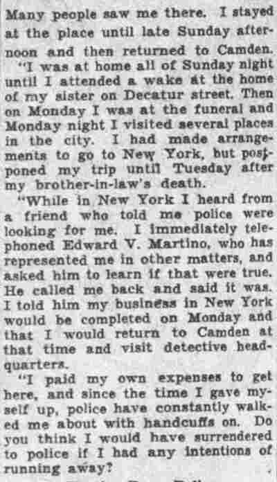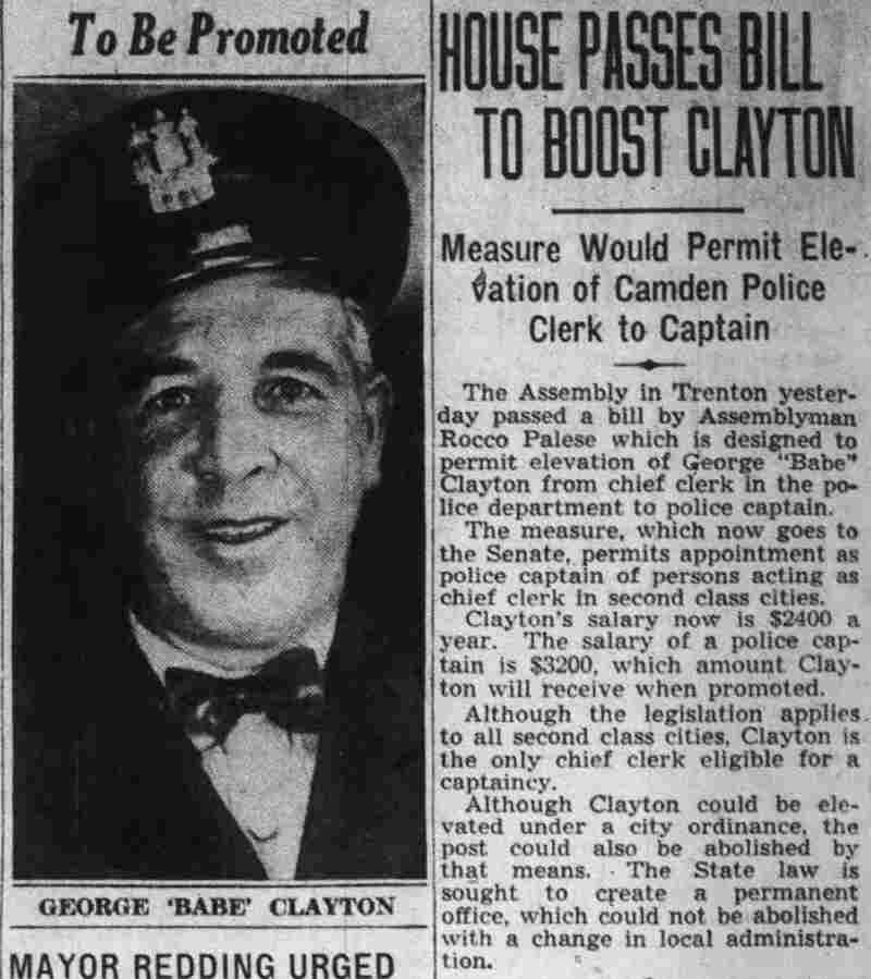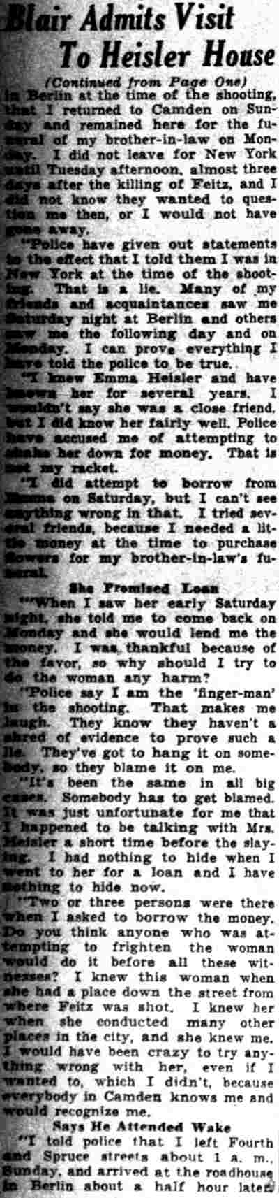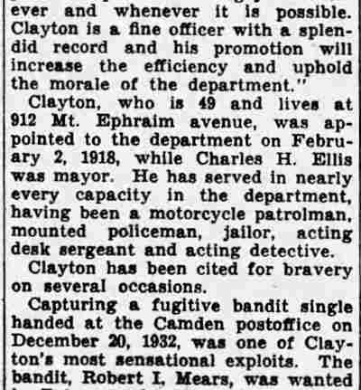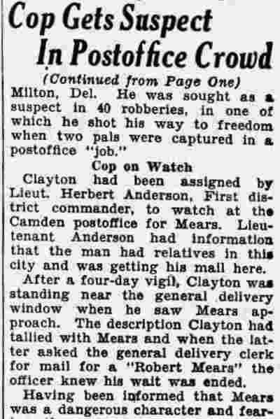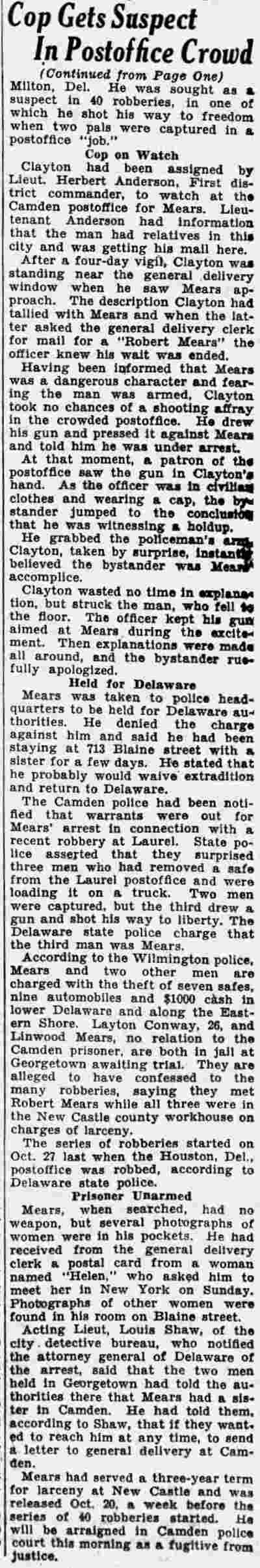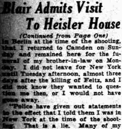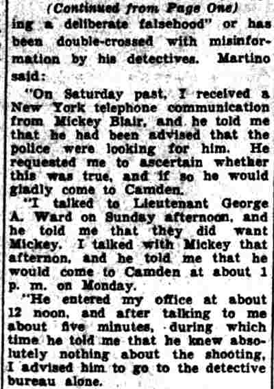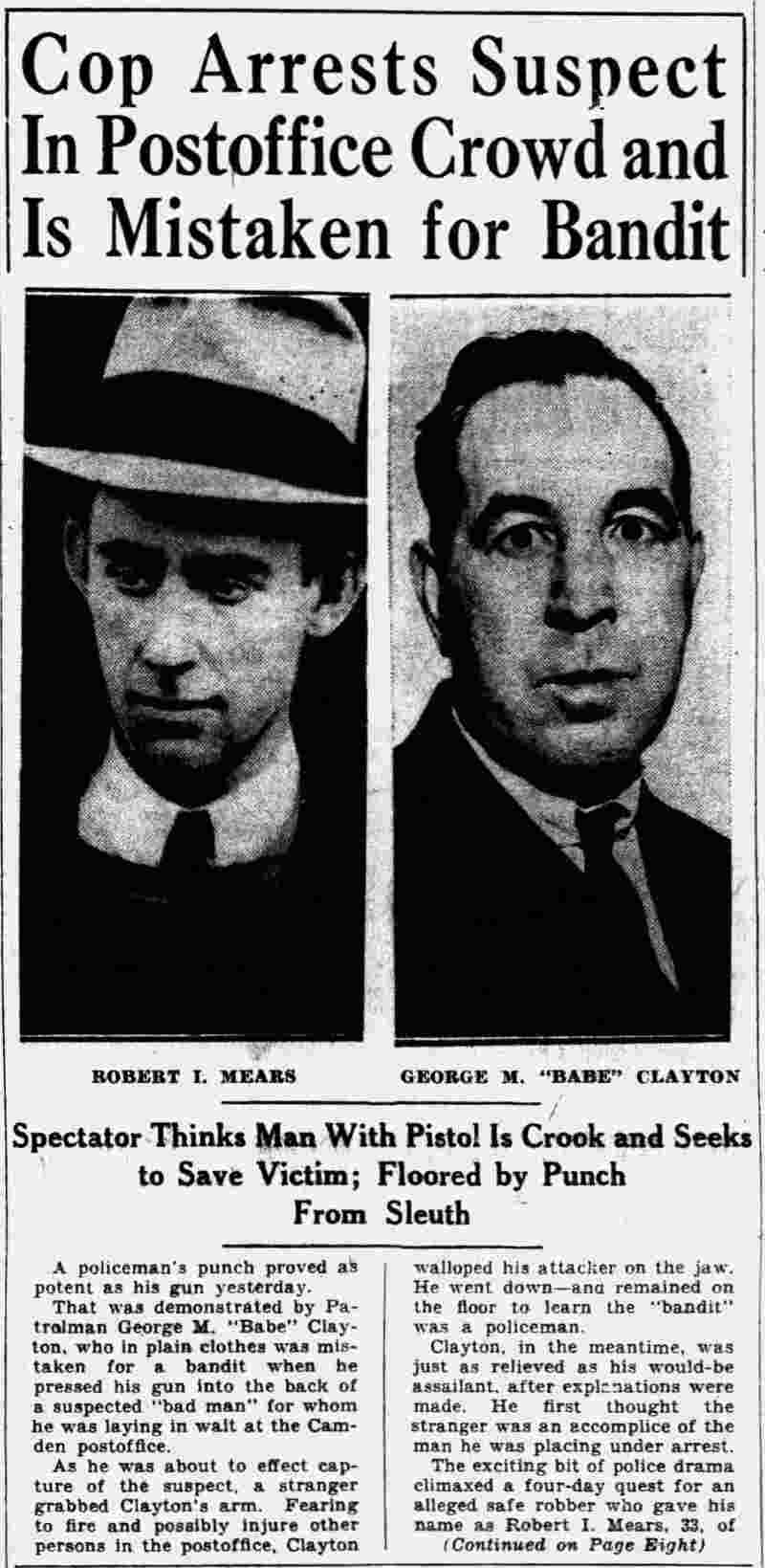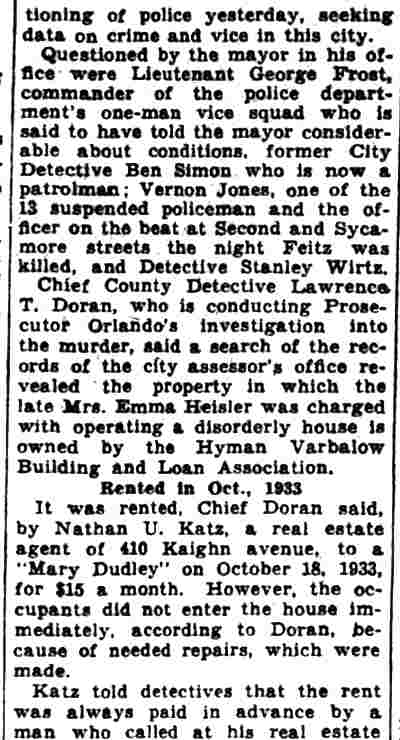 HERE IN NUMBERS QUIZ Arrests in the numbers racket in Camden continued today simultaneously with the continuation of the inquiry into the murder of City Detective William T. Feitz Jr. With the Feitz slaying probe in its eleventh day- the detective was slain September 2 at 243 Sycamore Street, an alleged disorderly house- city and county authorities were still questioning witnesses in an endeavor to obtain sufficient evidence to name the murderer or murderers. The arrest this morning of Crawford Smith, 51, of 702 Carman Street, as a numbers writer, brought the total of those apprehended this week in the numbers racket to 10. At the same time Police Judge J. Harry Switzer held Fred Klosterman, 33, of 1050 Mechanic Street, in $5000 bail for the grand jury on a charge of operating a numbers game. Klosterman's brother, Joseph Klosterman, 35, of 1400 Mechanic Street, was released in $3000 bail yesterday by Judge Switzer on a charge of operating a numbers lottery. The Klostermans. according to police, are among the topnotch numbers barons of the city. Both pleaded not guilty to the charges against them. No Testimony Taken Fred Klosterman surrendered voluntarily yesterday afternoon when he learned that police were seeking him as an alleged numbers operator. He was arraigned in police court today on complaint of George Zeitz, a city detective, who charged him with operating a numbers game. Police did not reveal where Fred Klosterman allegedly operated. There was no testimony taken at the hearing of Fred Klosterman. His bail bond was signed by John Zubien. Police say they do not know Zubien's address. Mrs. Anna Bubnoski, of 1426 Mount Ephraim Avenue, posted the $3000 bail for Joseph Klosterman. Zeitz also had made complaint against him. Fred Klosterman surrendered yesterday, according to police, after a defendant in police court testified that he was employed at an alleged numbers bank operated by Fred Klosterman. Zeitz swore to a warrant for Fred Klosterman's arrest based on the police information, he said. Hearing Tomorrow Smith, who was arrested by George Clayton, a policeman, will be given a hearing in police court tomorrow as an alleged numbers writer. Meanwhile no disposition was made in the case of Mrs. Mollie Schwartz, 42, who was arrested yesterday on a charge of operating a still at a double dwelling at 3404 Rosedale Avenue. Police Lieutenant John Potter said the woman admitted operating the still. A man said to be a brother of Mrs. Schwartz fled in his undershirt at the time of the raid, as Sergeant Edward Hahn and Policeman Joseph Keefe were making the arrest and seizure. The seizure included 13 barrels of alleged mash, a stove, one cooler, three gallons of liquor, and a 75 gallon still. Police reported that one of two cars without license tags which had been parked in front of the house disappeared later. Cops to Aid State Strict cooperation with the State Alcoholic beverages Commission in the detection, closing up, and prosecution of speakeasies is being given by the Camden Police Department. That statement was made today by Mayor Roy R. Stewart, who is the director of the department of public safety, and came as a result of an interview which Howard B. Dyer, an investigator with the state beverage commission had with the mayor. Dyer was formerly deputy city clerk. "Dyer came in and asked for the cooperation of the police department," said Mayor Stewart, "and I told him we would cooperate fully". The state alcoholic beverage commission, through its investigators, has been busy in running down speakeasies, stills and other illicit liquor practices. |