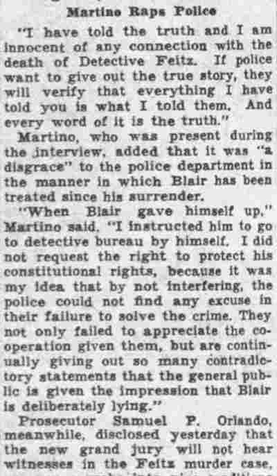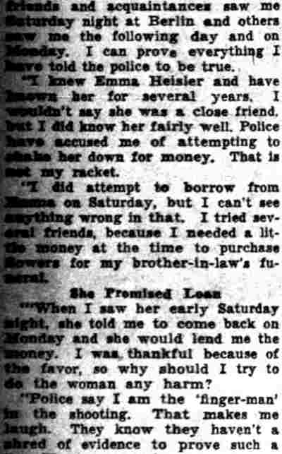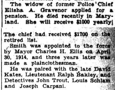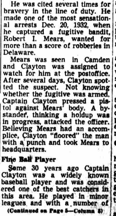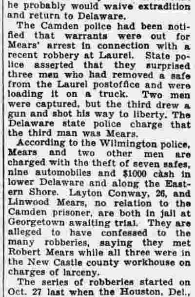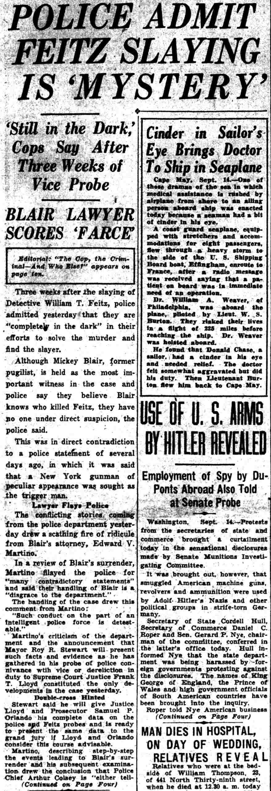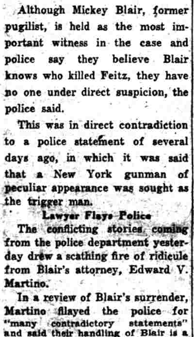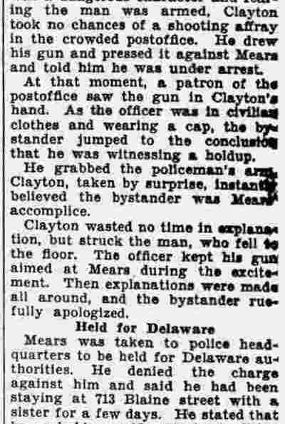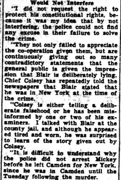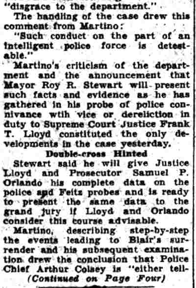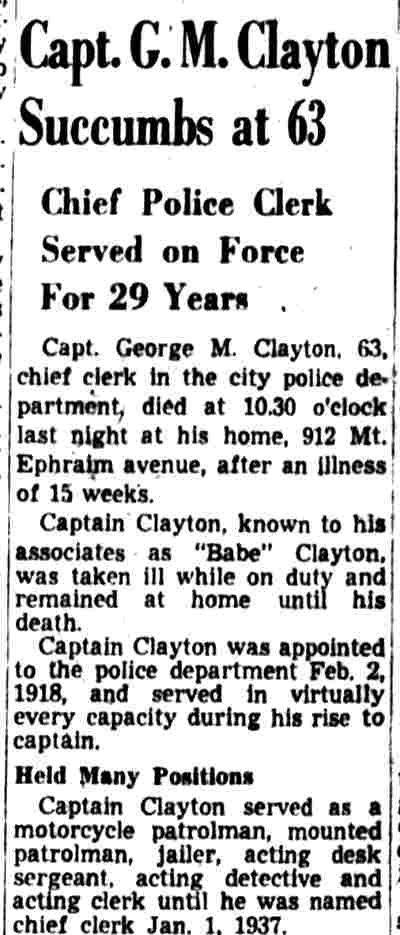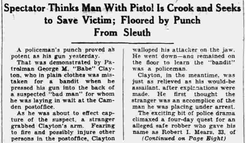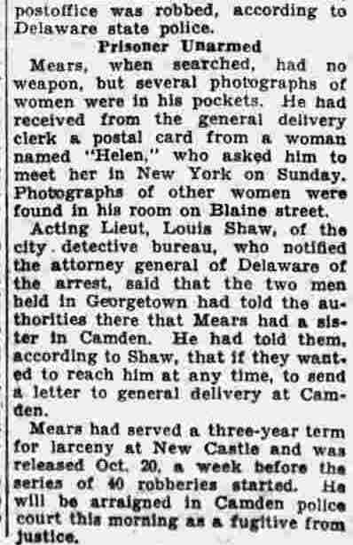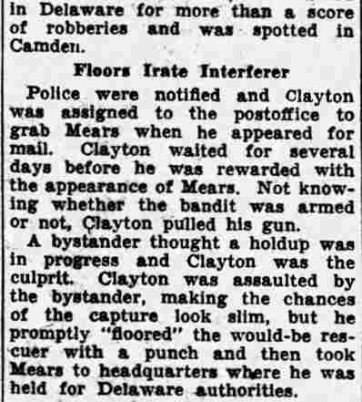 HERE IN NUMBERS QUIZ Arrests in the numbers racket in Camden continued today simultaneously with the continuation of the inquiry into the murder of City Detective William T. Feitz Jr. With the Feitz slaying probe in its eleventh day- the detective was slain September 2 at 243 Sycamore Street, an alleged disorderly house- city and county authorities were still questioning witnesses in an endeavor to obtain sufficient evidence to name the murderer or murderers. The arrest this morning of Crawford Smith, 51, of 702 Carman Street, as a numbers writer, brought the total of those apprehended this week in the numbers racket to 10. At the same time Police Judge J. Harry Switzer held Fred Klosterman, 33, of 1050 Mechanic Street, in $5000 bail for the grand jury on a charge of operating a numbers game. Klosterman's brother, Joseph Klosterman, 35, of 1400 Mechanic Street, was released in $3000 bail yesterday by Judge Switzer on a charge of operating a numbers lottery. The Klostermans. according to police, are among the topnotch numbers barons of the city. Both pleaded not guilty to the charges against them. No Testimony Taken Fred Klosterman surrendered voluntarily yesterday afternoon when he learned that police were seeking him as an alleged numbers operator. He was arraigned in police court today on complaint of George Zeitz, a city detective, who charged him with operating a numbers game. Police did not reveal where Fred Klosterman allegedly operated. There was no testimony taken at the hearing of Fred Klosterman. His bail bond was signed by John Zubien. Police say they do not know Zubien's address. Mrs. Anna Bubnoski, of 1426 Mount Ephraim Avenue, posted the $3000 bail for Joseph Klosterman. Zeitz also had made complaint against him. Fred Klosterman surrendered yesterday, according to police, after a defendant in police court testified that he was employed at an alleged numbers bank operated by Fred Klosterman. Zeitz swore to a warrant for Fred Klosterman's arrest based on the police information, he said. Hearing Tomorrow Smith, who was arrested by George Clayton, a policeman, will be given a hearing in police court tomorrow as an alleged numbers writer. Meanwhile no disposition was made in the case of Mrs. Mollie Schwartz, 42, who was arrested yesterday on a charge of operating a still at a double dwelling at 3404 Rosedale Avenue. Police Lieutenant John Potter said the woman admitted operating the still. A man said to be a brother of Mrs. Schwartz fled in his undershirt at the time of the raid, as Sergeant Edward Hahn and Policeman Joseph Keefe were making the arrest and seizure. The seizure included 13 barrels of alleged mash, a stove, one cooler, three gallons of liquor, and a 75 gallon still. Police reported that one of two cars without license tags which had been parked in front of the house disappeared later. Cops to Aid State Strict cooperation with the State Alcoholic beverages Commission in the detection, closing up, and prosecution of speakeasies is being given by the Camden Police Department. That statement was made today by Mayor Roy R. Stewart, who is the director of the department of public safety, and came as a result of an interview which Howard B. Dyer, an investigator with the state beverage commission had with the mayor. Dyer was formerly deputy city clerk. "Dyer came in and asked for the cooperation of the police department," said Mayor Stewart, "and I told him we would cooperate fully". The state alcoholic beverage commission, through its investigators, has been busy in running down speakeasies, stills and other illicit liquor practices. |