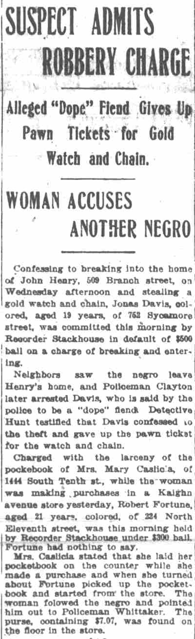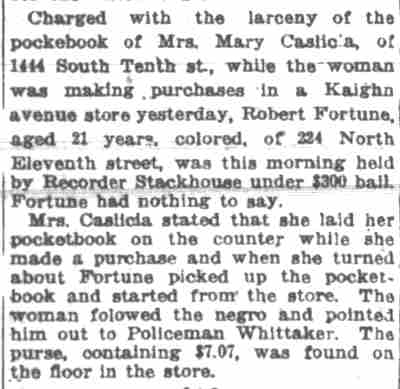 JAILED FOR ILL INTENT If you want to hit a man but can't because a member of the constabu-lary is at hand, that's assault. Police Judge Garfield Pancoast so ruled yesterday in making an interpretation of the law to Walter Beasley, 25, colored, of 1128 Cooper Street, who was sentenced to 60 days in jail because he said he desired to punch another man. Beasley was arrested Sunday night at Tenth and Cooper Streets by Patrolman George Clayton. Clayton was assisting an ill man when Beasley approached and threatened to hit the man. Clayton locked him up. "I'd still like to take a punch at him," Beasley said in court yesterday. "You would, would you?" asked the judge. "Well, intending to strike someone is assault. If you do hit him, it's assault and battery. So I sentence you to 60 days for assault." |