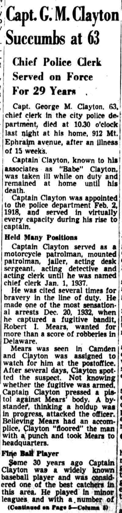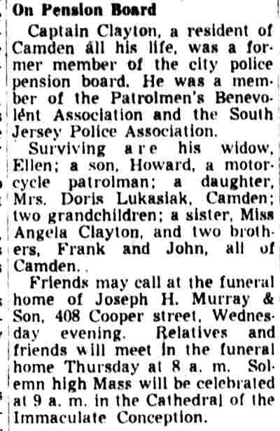 AND FIREMEN WILL ELECT TODAY The Camden Police and Firemen's Association will hold election of officers today at its headquarters, 1175 Whitman Avenue, from 1:00 PM to 9:00 PM. Herbert Bott is unopposed for re-election as president. William Thorn is unopposed to replace Richard Middleton for financial secretary and Walter Vecander is unopposed for the new post of assistant financial secretary. All these are police officers. The police trustees will be named from the following nine candidates: William Marter, George Ward, William Britner, Joseph Shreeve, William Schriber, Joseph Mardino, Joseph Dunnett, Leon Feltz and Russell Young. Two police sergeant-at-arms will be chosen from among Stanley Wirtz, Harry Cattell, Joseph Schultz and George Clayton . Three candidates are seeking the post of vice president, which goes to a fireman. They are William Spencer, Charles Edwards and albert dukes. Warren Rich, a fireman, is slated to succeed himself as recording secretary and Winfield Leviseur is unopposed for the new post of assistant recording secretary, which goes to a fireman. Four fireman trustees will be chosen from ten candidates. They are charles cook, Henry Baumgartel, walter eastlack, Arthur Batten, William Getner, William Toy, lawrence newton, James Young, Russell Anderson and William Taylor. Three firemen are seeking two posts as sergeants-at-arms. They are William Judge, John Mulligan and Furman Price. |