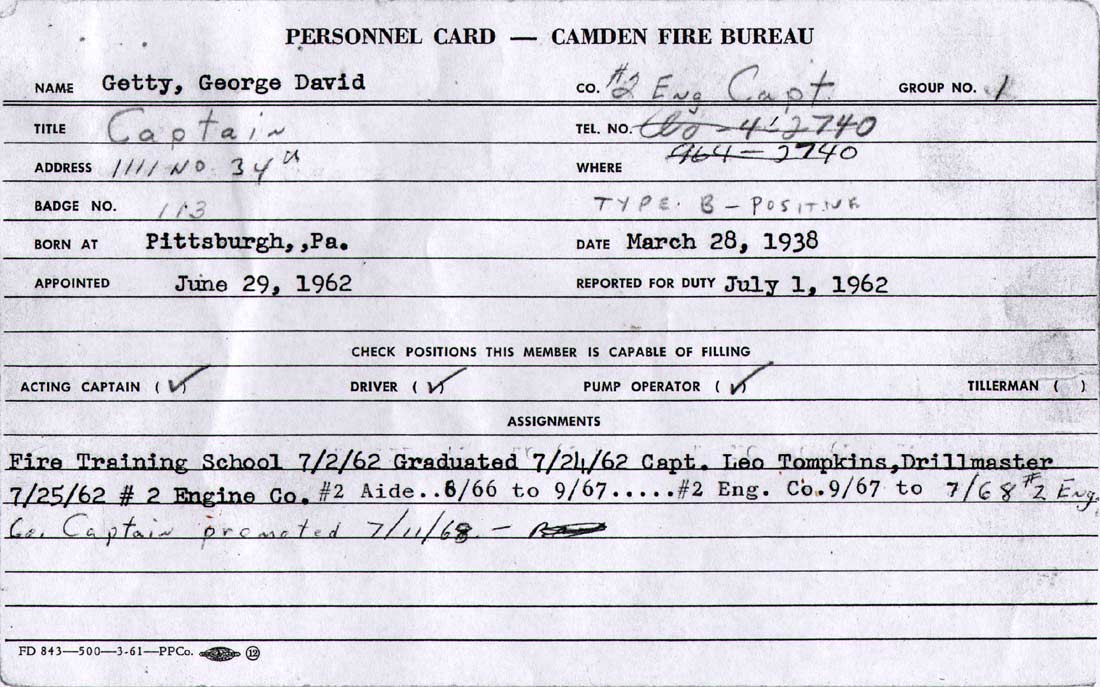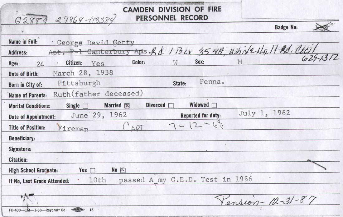 GEORGE DAVID GETTY SR. was born in Pittsburgh, Pennsylvania on March 28, 1938. He left school after the 10th grade and went into the United States Army, where he received his G.E.D. in the Army in 1956. While in the Army George D. Getty served as a paratrooper. George D. Getty was appointed to the Camden Fire Department on June 29, 1962. He reported for duty at the Fire Training Academy on July 1 and, after training under Captain Leo Tompkins, graduated on July 24, 1962 and was assigned to Engine Company 2. George D. Getty was promoted to Captain of Engine 2 on July 11, 1968. |