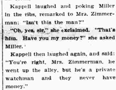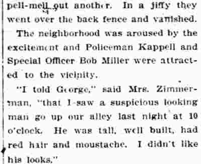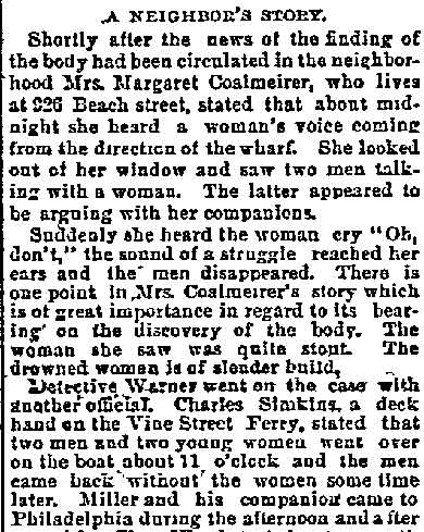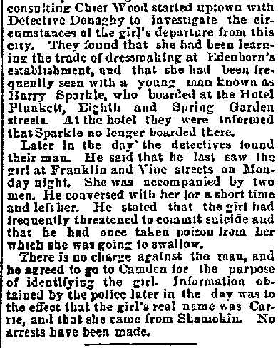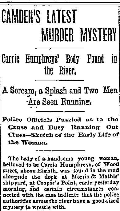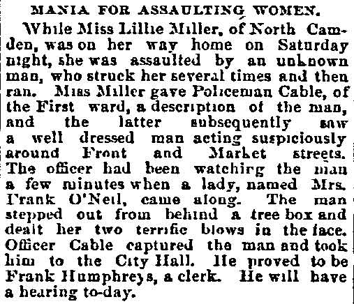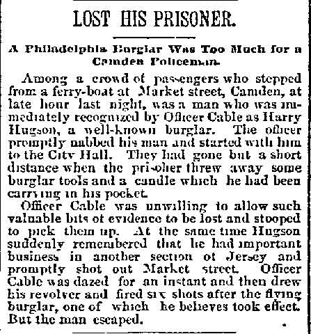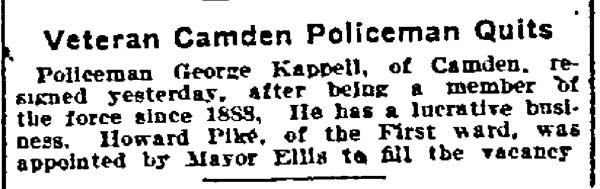 GEORGE FREDERICK KAPPEL aka George Cable, was born in Camden around 1866 to Frederick and Lizzie Kappel. The family name appears spelled "Cable" in City Directories and newspapers into the early 1890s. George F. Kappel's father, Frederick Kappel, came to Camden from Germany, and in his young manhood fought in the Civil War. He later worked in a lumber yard. The Frederick Kappel family made its home on 530 North Front Street from the 1870s through the 1890s, except for a brief period around 1880. The family was at 530 North Front Street in 1878. The 1880 Census shows the family, which included younger sisters Lizzie and Amelia, living at 538 French's Court, a short street that was in the 400 block of Sycamore Street in South Camden. The family moved back to 530 North Front Street by the middle of 1882. By 1884 they had settled in at 538 North Front Street. The 1879-1880 City Directory states that George Kappel had gone to work as a spinner in one of Camden's textile mills. He was listed in the 1884-1885 and 1885 City Directories at 538 North Front Street, living with his parents. George Kappel married early in 1887. The 1887-1888 City Directory states that George F. Kappel was living at 5 England Place in Camden and working as a bleacher in 1887. His son, George W.A. Kappel was born that September, daughter Anna and son Elwoood came soon after. George F. Kappel was worked as an extra man with the Engine Company 2 of the Camden Fire Department in 1887. By the middle of 1887 the Kappel family had moved to 523 North Front Street, and George F. Kappel had secured an appointment to the Camden Police Department. He would remain connected with the Camden Police Department for twenty-three years. The family had moved to 108 Birch Street in North Camden by the middle of 1890. The 1892-1893 and 1893-1894 Directories shows George Cable residing at 609 North Front Street. He is not listed in the 1894-1895 City Directory, but was still being referred to as "George Cable" in the press as late as December of 1894. In 1895 George F. Kappel appears to have stopped using the "Cable" spelling once and for all. The 1895-1896 City Directory shows that he had moved to 102 Pearl Street, next door to the saloon owned by John Dugan and family. The Kappel family was still at that address when the census was taken in 1910. George F. Kappel retired from the Camden Police Department on May 14, 1910. After Mr. Kappel's son George W.A. Kappel, mastered the steamfitter's and heating trade, father and son formed The Camden Heating Company in May, 1905, and the concern was incorporated in 1907. The firm became well known as specialists in heating and ventilating of all sorts, and were located at 8 Market Street, in Camden. With the family business well in hand, George F. Kappel retired from the Camden Police Department on May 14, 1910. Wife Emma having died in the 1910s, George F. Kappel was a widower by January of 1920. His later years were spent at 311 Penn Street in Camden. He passed away on July 6, 1924. |