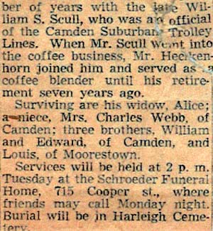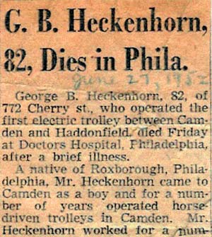 GEORGE B. HECKENHORN was born in Pennsylvania to Henry and Mary Partenheimer Heckenhorn in 1869. His first cousin was William Penn Partenheimer Jr., longtime head of the YMCA in Camden. Henry Heckenhorn family moved to Camden when he was a young boy in the mid-1880s. George Heckenhorn had two younger sisters, Kate and Sarah, and four younger brothers, William, Edward, Lewis, and Howard. William Heckenhorn was Camden's first Harley-Davidson motorcycle dealer, and later went on to a long and successful career as a stockbroker. Sadly, youngest brother Howard was killed while operating a motorcycle in May of 1914. By 1890 the Henry Heckenhorn family was living at 921 South 8th Street. George Heckenhorn worked briefly as a driver for the Camden Horse Railroad Company. When electric trolleys were introduced to Camden, George Heckenhorn, working for the Camden Suburban Trolley line, was the first operator. By 1895 George Heckenhorn had left the streetcar line to take a job with the coffee firm of William S. Scull & Company, for whom he would work for fifty years, as a coffee blender. The Heckenhorn family moved to the 700 Block of Cherry Street around 1910, with the exception of William, Kate, and Sarah, who had married and set up their own homes. Henry Heckenhorn had a home at 764 Cherry, while George Heckenhorn lived at 772 Cherry with his wife Alice. George and Alice Heckenhorn would reside at 772 Cherry Street until Georgfe's death in 1952. George Heckenhorn passed away at Doctors Hospital in Philadelphia on June 27, 1952. He was survived by his wife Alice, and brothers William, Edward, and Louis. George and Alice Heckenhorn were not blessed with children but they did raise a niece, Florence, who also survived them. |