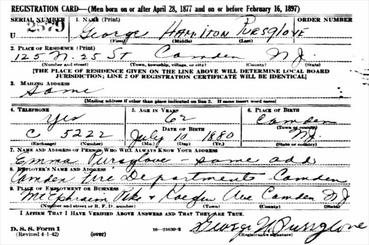 GEORGE H. PURSGLOVE was born in Camden, New Jersey on July 10, 1880 to Charles Watson Pursglove and his wife, the former Mary Elizabeth Hamilton. He was the sixth of eight known Pursglove children, coming after Mary, Elizabeth, William, Charles, Emma, and before Harry and Clarence Pursglove. From 1887 through 1890 the Pursglove family lived at 138 Walnut Street in South Camden. The 1900 Census shows the family at 1243 Liberty Street. George H. Pursglove was then working as a laborer. George H. Pursglove had married Emma Beatty in 1903 and had moved to 751 Mount Vernon Street by 1910. They marriage produced two daughters, Myrtle in 1905 and Jeannette "Nettie" Pursglove in 1909. A son, Leroy, came in September of 1912. In the early 1910s brother Clarence Pursglove married Evelyn Patten, of 757 Mount Vernon Street. The brothers would live at these two homes through at least the end of 1926. George H. Pursglove became a member of the Camden Fire Department in the mid-1910s. He resigned from the department in March of 1918 to take a higher-paying job in one of Camden's shipyards. Clarence Pursglove was appointed to replace him. By January of 1920 George Pursglove had returned to the Fire Department. Both brothers would work as Camden firemen into at least the end of 1946. As stated above, George H. Pursglove and his brother Clarence were still living in the same homes on Mount Vernon Street as late as the end of 1926. When the 1929 Camden City Directory was compiled, George Pursglove and family had moved to 103 Eutaw Avenue in East Camden. Fire department record from 1931 show George Pursglove residing at 131 North 25th Street. George and Emma Pursglove were still living at 125 North 25th Street in East Camden when when the 1947 Camden City Directory was compiled. Both Pursglove brothers are noted in this directory as working for the Camden Fire Department. Son Leroy Pursglove ws living with his wife Mildred at 24123 Arthur Avenue in Cramer Hill when the 1946 City Directory was compiled. He was then working as a bartender at the U-Need-A Cafe on Federal Street in East Camden. Leroy Pursglove passed away in December of 1960. |