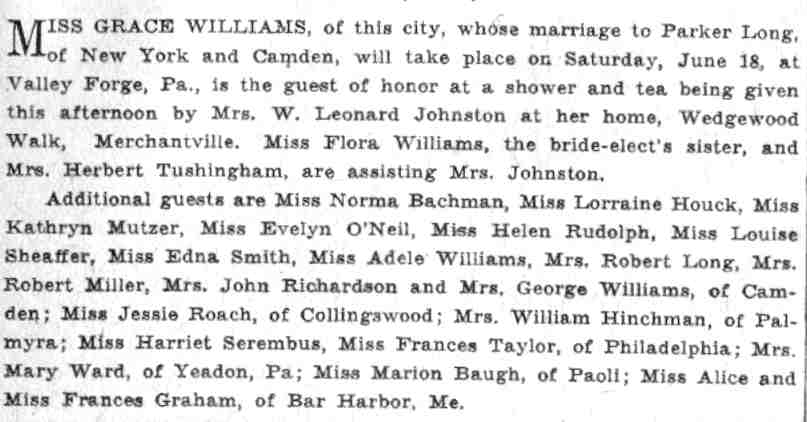 GEORGE HAROLD WILLIAMS worked as a pharmacist in Camden for well over 40 years. Born in Pennsylvania on May 6, 1871 in Berwyn, Chester County, Pennsylvania, he appears in Camden in the 1900 Census, living at 331 North 4th Street, the corner of North 4th and Linden Street, where he boarded with his employer, the pharmacist Lewis H. Wilson Sr. Bt 1904 George H. Williams had gone to work elsewhere, and made his home at 300 Kaighn Avenue, where he most likely also worked. He married Bertie Grace Stevenson 1906 or 1907, and with wife Bertie had two children, Grace and Flora. The 1908 Camden City Directory shows that 1908 Dr. Grant E. Kirk had hired George H. Williams to work as a pharmacist at 1801 Broadway. George Williams moved from 300 Kaighn Avenue to a house that Dr. Kirk apparently had an interest in at 1715 Broadway. The 1908 City Directory indicates that he had moved to 1715 Broadway, and was working as a "drug clerk". This property appears to have been owned by Dr. Kirk, who was the son-in-law of noted Camden physician Dr. John Donges. Dr. Donges had began practicing medicine at 1801 Broadway around 1871, and his son-in-law made his home and practice at that site as early as 1897. The 1911 City Directory shows George H. Williams as the manager of the pharmacy at 1801 Broadway. Dr. Kirk appears to have sold 1801 Broadway to George H. Williams in time for publication in the 1914 Directory. Dr. Kirk appears to have moved his offices, and perhaps his residence, to 1715 Broadway, where George H. Williams had lived, before later moving to Collingswood NJ. George H. Williams would live at and conduct his pharmacy there until his death on December 21, 1941, his wife having preceded him in death in March of that year. |