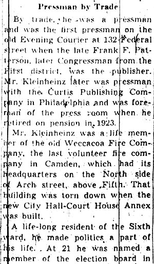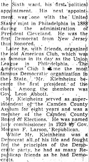 Gallaher to Be Named County Solicitor Vincent J. Gallaher, of Collingswood, a Camden attorney and chairman of the Camden County Democratic Committee, will be elected county solicitor at tonight‘s regular meeting of the coalition-controlled Camden County Board of Freeholders. This was learned through two unimpeachable sources yesterday. Gallaher informed close friends he would be chosen for the post. Gallaher will be chosen despite claims of Walter S. Keown, present county solicitor, that he cannot he removed from the position. Reports last week that Keown had decided to resign without a fight to keep his job were declared by him to be false. He said yesterday he had no statement to offer. Further it was learned that Keown was sworn in as county solicitor by Deputy County Clerk Truax on January 7. It was the first time he had even taken the oath of office. Others Take Oath Truax also admitted a number of other county officials were sworn in last month. No record of the other officials previously taking the oath of office is on file in the county clerk's office. "As I understand the law the county solicitor does not have to take the oath of office," Truax said. "The act specifically sets forth that he shall be elected for a term of three years. Mr. Keown was elected county solicitor on January 1, 1937. "An act does require the county physician must be sworn in by the county clerk or deputy clerk. Dr. Edward B. Rogers, who was elected county physician, neglected to take the oath. It is understood that City Solicitor Firmin Michel recommended the appointment of Gallaher, who also is said to have the endorsement of Commissioner Mary W. Kobus, who successfully directed the coalition movement that wrested the control of the Board of Freeholders from the Republicans after an uninterrupted reign of 92 years. Michel with Isadore H. Hermann and Edward V. Martino, all affiliated with the Camden city legal department, are said to have looked up the law and reached the unanimous conclusion that Keown can be ousted from his job and that Gallaher’s appointment will withstand all tests in the courts. Other Jobs in Doubt Other present Republican jobholders may also be routed out of office at tonight's meeting of the freeholders, it was indicated. Apparently some who have held county jobs, many for long periods; anticipate the freeholders plan to replace them. Among several known to have taken oaths of office during the last month are Mrs. Grace Anthony Riggins, superintendent of the county juvenile detention home; William B. Macdonald, county court stenographer; George R. Braunwarth, custodian of the Court House-City Hall; his assistant, Thomas B. Dickinson, Jr.; Jacob Price, county supervisor of roads; Martin J. McNulty, county purchasing agent, and Dr. Lee J. Hammett, secretary-treasurer of the Camden County Welfare Board. Ali members of the Camden County Park Commission have been sworn in. They include Leroy A. Goodwin, president; Dr. Frank O. Stem, treasurer; Horace L. Brewer, assistant treasurer; former Mayor Roy R. Stewart, William H. Dunn, of Collingswood; J. William Markeim, of Haddonfield and george kleinheinz, of Camden. Royden S. Matlack, assistant county treasurer and assistant auditor to the board of freeholders was sworn in on January 13, for both positions. Truax did not attach any significance to the fact that the number of officials decided to take their oaths of office. Following the appointment of Dr. David S. Rhone as county physician, Dr. Rogers did not legally oppose the naming of his successor. Records of the county clerk's office show that Dr. Rhone was the first county physician to be sworn in and to sign the "book," as the official registry is called by attaches of the office. |
