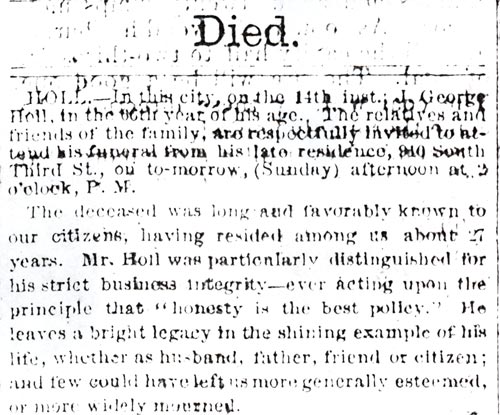 GEORGE M. HOLL and his brother, Lewis F. Holl, were builders who erected many houses and commercial buildings in Camden in the late 19th and early 20th centuries. George Holl was born in 1840 in Pennsylvania to John George and Catherine Holl. John George Holl was baker by trade. The family had moved to Camden by 1851. John George Holl became a well known and much respected member of Camden's business community over the next 20 years. George Holl served with in the Union army during the Civil War, and was noted for distinguished service. He enlisted as a Sergeant on April 25, 1861, on the 27th he was assigned to Company G, 4th New Jersey Infantry New Jersey Regiment. George Holl mustered out from Company G, 4th New Jersey Infantry Regiment on July 31, 1861 in Trenton, NJ. He appears on the roster as a Lieutenant 2nd Class, commissioned on June 17, 1863 with the Independent Company, 1st New Jersey Militia Infantry Regiment and his Civil War pension record also indicates service in the 6th New Jersey Infantry Regiment. At the time of the 1870 Census, brother Lewis Holl, also a baker, had married and was the father of a daughter, Emma, while George, still at home with his parents, was the proprietor of a "gent's furnishings store". Also at home were his sister Louisa, 19 and brother Charles, 17. John George Holl passed away in September of 1871 at the age of 66. The family at that time lived at 910 South 3rd Street, the corner of South 3rd Street and Joint Alley. A newspaper article from July of 1874 shows George M. Holl living at 706 South 5th Street. The 1876 and 1877 City Directories have the Holl family at 516 Line Street. From 1878 to 1881 City Directorues show the family at 611 Broadway. When the 1880 Census was taken two siblings were also at home, younger brother Charles and younger sister Louisa Holl, who married in 1872. George Holl married Laura Stockton in June of 1873. They had three sons who died in infancy. By 1880 George and Lewis Holl went into real estate and construction. In 1886, George Reeser Prowell wrote of George Holl, in his book History of Camden County, New Jersey : Among the builders of Camden are several who have erected five or six hundred houses each. The heaviest operators are undoubtedly Cohn & roberts, Wilson Ernst, and George Holl. George Holl, who has been engaged in building for eighteen years, has erected from four to five hundred houses, principally in the central part of the city. They are nearly all of what may be denominated the medium class, in size and pretensions. His brother, Lewis F. Holl , has built many houses in the lower part of town. The 1887-1888 directory for Camden shows george holl at the corner of Broadway and Benson Street, and the directory for 1888-1889 has him at 310 broadway. Lewis F. Holl lived with his wife Willimina, daughter Emma, and newborn son Arthur at 328 Mount Vernon Street. Emma Holl was then working as a school teacher. Their widowed mother Catherine lived at 709 broadway as late as 1891. Arthur H. Holl would go to have a long and distinguished career as a funeral director and served as Camden County Coroner at different intervals. The Holl name would remain in public view until 2001, when his Haddonfield funeral home would change hands and the Holl name was discontinued. After returning to Camden from Bordentown NJ, Edward N. Cohn had bought land from John F. Starr Jr. in north camden. Cohn partnered with George Holl and Joseph E. Roberts, president of the West Jersey Railroad Company to build many two- and three-story row and frame houses from in North Camden, from Cooper's Point to Pearl Street, which they sold and rented out to working class people. In late 1887 and early 1888 George M. Holl built houses on Washington Street east of Broadway. He later made his home at 310 Broadway, where he spent his final years. Around 1890 the Holl brothers erected a block of twelve three-story business properties on the east side of Broadway between Mickle Street and Stevens Street. This block became known as the Holl block. Late in 1890 he acquired the land on which Chambers Avenue was laid out and homes were built. George Holl passed away on April 16, 1912. Lewis Holl joined him on December 18, 1919. The brothers were buried in adjoining plots at Evergreen Cemetery in Camden. The properties on Broadway remained in the family for a time, but eventually found their way into Orphans Court, and were sold at auction in 1941. George Holl's home at 310 broadway was purchased by the city in 1921 and was leased to theAugust F. Walters Post No. 4 of the Disabled American Veterans, who occupied the building through the summer of 1936. In 1942 the Holl block was demolished, and 10 one story stores were built which remain in use as of April of 2003. However, there are many homes that George Holl had built in South Camden and in North Camden which remain in use today. |