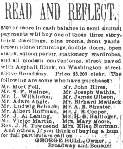 George Holl lived in the large house with the yard at the corner of Broadway & Benson. Third house up, with white roof, belonged to Dr. A.E. Street. The Holl Block is visible on left, at the far end of Broadway.