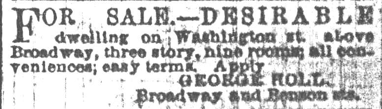 At the other end of the square, Broadway and benson streets, Holl had erected his home. It was and is for that matter, a two-story brick with mansard roof and setting back from Benson Street. That side yard Holl likewise embellished with flowers of the season. It was the delight of anyone with half an eye to beauty from early spring to late fall. It started with great beds of tulips. It closed with chrysanthemums with alluring blossoms throughout the summer.