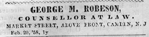 In 1855 Governor Newell appointed Mr. Robeson Prosecutor of the Pleas of Camden county, and he became a resident of Camden, holding his office of public prosecutor until 1860.