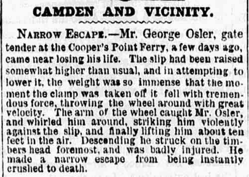George Osler was born in Pennsylvania around 1841 to Charles and Luvinia Osler. The family moved to Camden soon after he was born, and had locatged in Camden's North Ward by 1850. Charles Osler supported his family by working as a steamboat engineer, in time, George Osler would follow him in this profession. The 1860 Census shows the Oslers living in the North Ward. Besides George, the family included younger siblings Clark, Silenia, Henry, Hannah, Wilhelmina, and Caroline Osler. George Osler married in the 1860s, and a son, Walter Osler, was born around 1867. George Osler was working as a slip tender at the Cooper's Point Ferry in the summer of 1869. By the following year he had begun working as an engineer. When George Osler was appointed to the Fire Department, no address was entered into department records. City Directories indicate that he was living at 432 Lawrence Street in 1879. The 1880 Census shows the Osler family at 129 Mickle Street. By this time the Oslers had four more children at home besides Walter, Elizabeth, Harry, Reva, and Addie Osler. By 1883 the ferry at the foot of Federal and Market Streets had been acquired by the Pennsylvania Railroad. City Directories indicate that the railroad would be George Osler's employer and he would work the ferries the rest of his working days. He was living at 221 Broadway when the 1883-1884 Directory was compiled, and at 918 Market Street in 1884 and 1885. The 1887-1888 directory gives his address as 200 Washington Street. By the end of 1888 he had moved to 457 Berkley Street. The 1890-1891 Directory shows that he had moved to Stockton, that is, to what became East Camden in 1899. The address listed is "Penn Avenue near 25th, Cramer Hill", this street was renamed Howell Street after the 1899 annexation of Stockton by Camden. The Directories from 1892-1893 through 1894-1895 give an address of 420 Trenton Avenue for George Osler. He stayed at 835 Linden Street in 1896, and he was at 28 North 26th Street in Stockton when the 1897 edition was compiled. The 1898 Directory indicates that George Osler was living with his parents at 214 Arch Street. The 1900 Census shows George Osler, a widower, living at 76 South 24th Street in East Camden with his daughter Reva, her husband John Knecht and son Harry. George OSler was still working as an engineer at the time of the census. George W. Osler is not listed in the 1906 Camden City Directory or 1910 Census, but is listed in the 1910 City Directory at 32 Morse Street in East Camden. He is not listed in the 1914 Directory or the 1918-1919 Directory. |