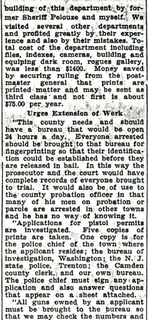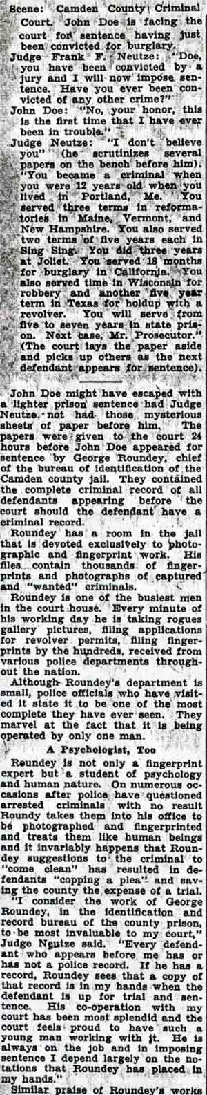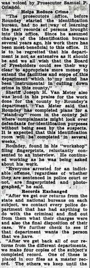 GEORGE ROUNDEY was born in 1905 in Bridgeton NJ to William and Anna V. Roundey. The family later moved to Vineland NJ where William Roundey worked driving an express wagon. George Roundey worked at the Camden County Jail in Camden until his death on February 23, 1947. By 1936 he was chief of the identification bureau at the jail, in charge of photographing and fingerprinting those who passed through the jail. He apparently became warden of the county jail sometime thereafter, working under the supervision of the Camden County Sheriff. |