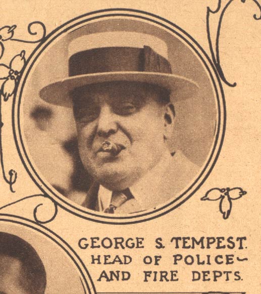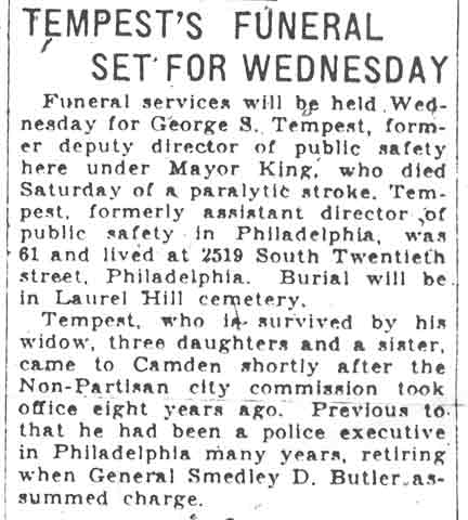 GEORGE S. TEMPEST was born in Pennsylvania in March of 1869. He lived in Philadelphia virtually his entire life. As a boy, he went to Girard College, a boarding school for poor orphaned and fatherless boys. After finishing his education he secured a position as an officer with the Philadelphia police department. When the 1900 Census was enumerated he was a member of the Philadelphia police department, and living at 2404 Catherine Street. He was then married, his wife Mary Burg Tempest having born four children, Mary, Frederick, Anna, and Eleanor. His sister Anna, and brother-in-law William Burg also lived with the family. By 1920 he had risen to the rank of Captain, and had moved to the next block, the family now residing at 2336 Catherine Street, his daughters, all still at home and working. Camden changed to the commission form of government in 1923. It appears that George S. Tempest was hired to run the police and fire departments, as Commissioner Dr. David S. Rhone, who had no law enforcement experience, was having a difficult time contending with bootlegging, gambling, and other "Roaring Twenties" criminal activities. He was in charge of the police when the "voodoo doctor of Liberty Street, Reyquew Hyghcock, came to the attention of law enforcement personnel. George S. Tempest apparently left Camden's service after the 1927 election, when General Winfield Price and and a Republican slate swept the races for Mayor and City Commission. He and wife Mary had moved to 25129 South 20th Street in Philadelphia. His daughter Mary was still at home, and working as a bank secretary. Daughter Eleanor and her husband George Bailey were also living there. George S. Tempest died of a stroke on January 31, 1931. |