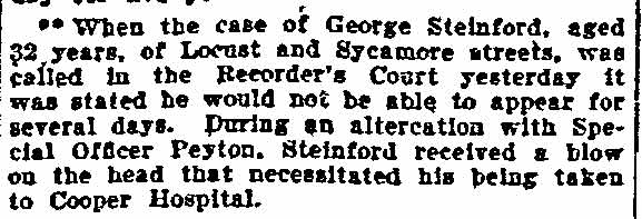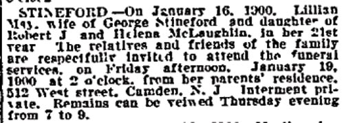 GEORGE HENRY STINEFORD JR. was born on January 26, 1873 in Pennsylvania to George H. Stineford and his wife, the former Louisa Rich. His father, a naval veteran of the Civil War, worked as a printer in the 1870s and early 1880s, and later worked as a plumber. When the census was taken in 1880 the family, which included younger sister Sarah "Sallie" Stineford, lived at 1244 Woodbine Street in Philadelphia. The family had moved to New Jersey in the early 1880s, and two more daughters came, Martha and Mary. The 1887 City Directory shows the Stinefords at 1134 South 3rd Street in South Camden. In the late 1890s George Stineford married Lillian May McLaughlin. Sadly, she passed away at the age of 21 on January 16, 1900. He never remarried. The 1900 Census shows George Stinford Jr. living with his parents and sisters at 1134 South 3rd Street in South Camden. He never remarried. George Stineford Jr. was then working as a tin and sheet metal roofer. George Stineford Sr. sat on the jury that convicted Paul Woodward of murder in he first degree in November of 1902. Around