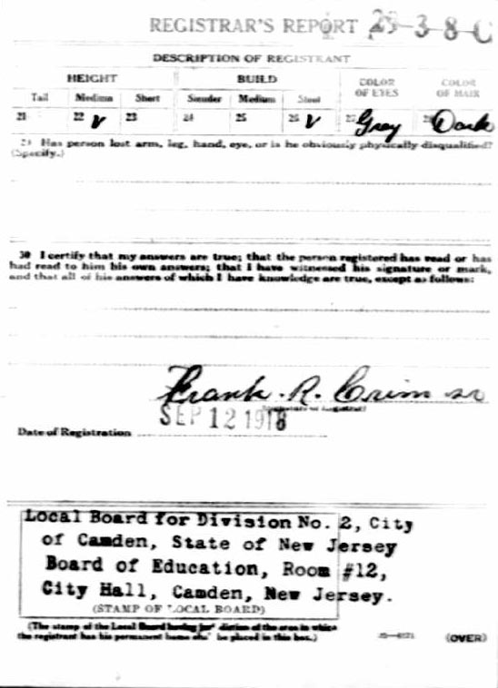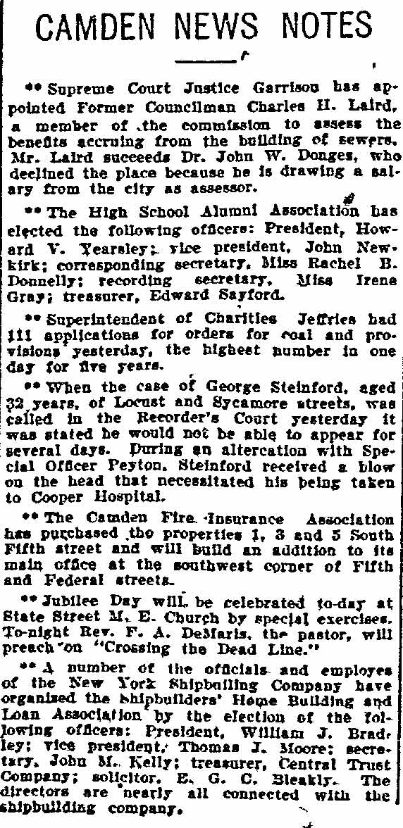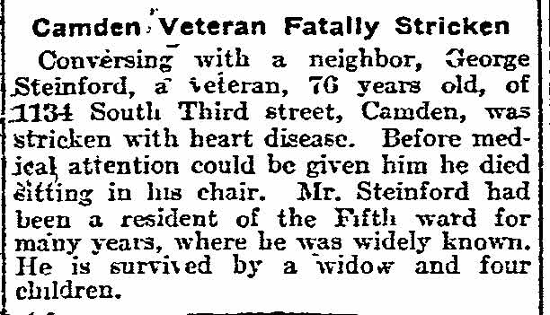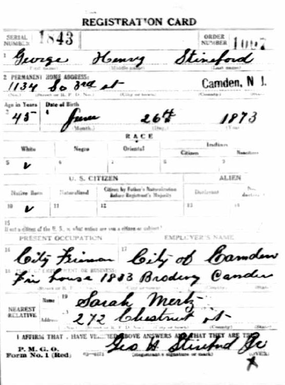 George Stineford Jr. was still working as a tin roofer when the 1906 City Directory was compiled. By April of 1910 he had been appointed to the Camden Fire Department. He was still living at 1134 South 3rd Street when he registered for the draft on September 12, 1918. By January of 1922 he had moved to a boardinghouse at 322 Sycamore Street run by John and Mary Shaw. By the end of 1926 he had moved to 320 Sycamore Street. He was still working for the Fire Department at that time, according to the 1927 Camden City Directory. George Stineford Jr. is not listed in the 1929 edition, but was in all probability still living in Camden. George Stineford Jr. had retired from the Camden Fire Department by April of 1930. He was boarding at 446 Mechanic Street, and was still at that address in 1937, George Stineford Jr. passed away on February 2, 1937 and was buried in Philadelphia at Fernwood Cemetery. |