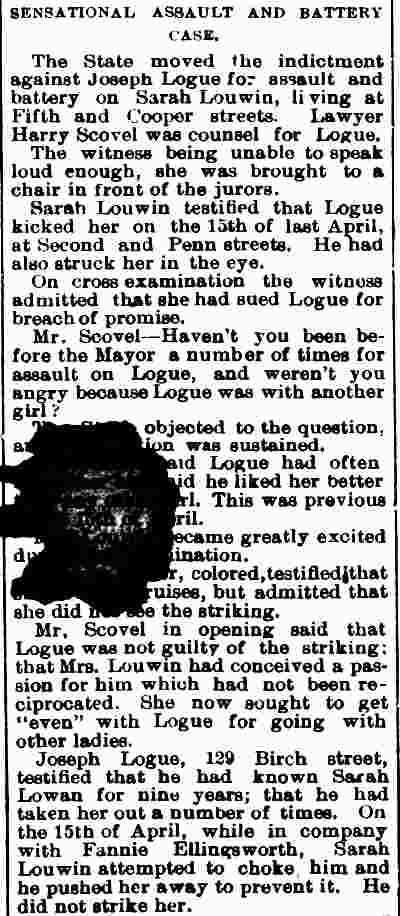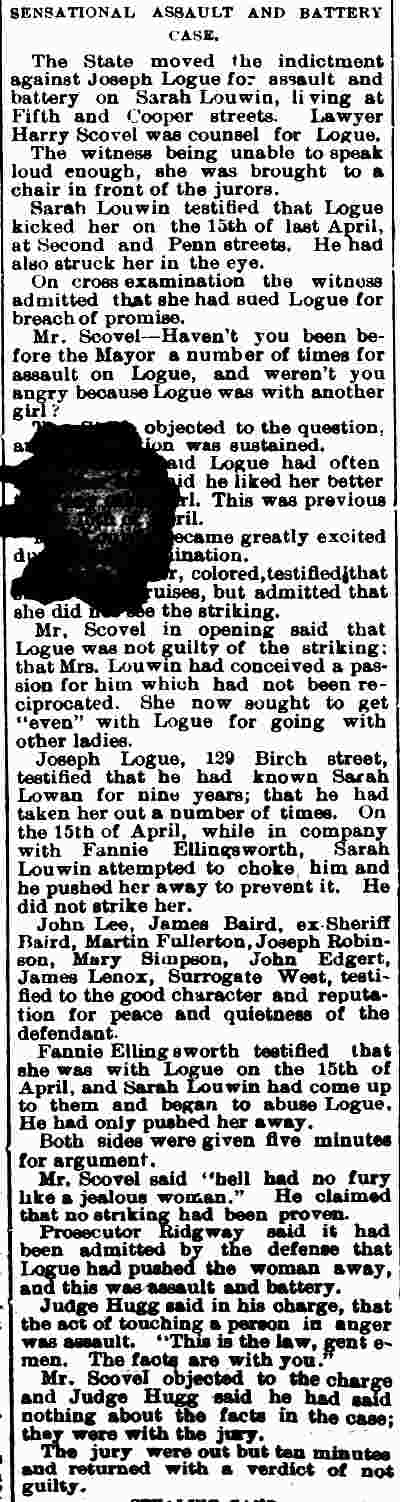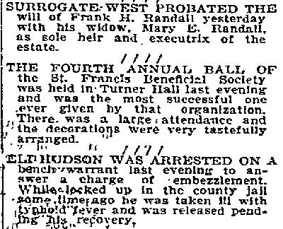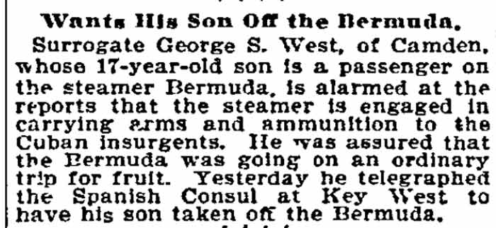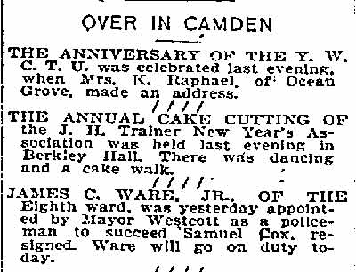 GEORGE S. WEST was born in Boston MA on September 12, 1851. His parents moved to Camden the following year. His father, who had been a soldier in the regular Army in the Mexican War, raised a company of volunteers in Ohio, but died of natural causes in 1861. George S. West received his education in Camden's public schools. He trained as a machinist, but did not follow that trade, instead engaging a salesman of wholesale clothing and notions. He eventually opened up his own business, an auction house, which prospered. He married Miss Mary Charles in 1876. George S. West involved himself in military affairs and politics, as a Republican. He served three one year terms on Camden City Council from the Fourth Ward in the 1880s, and was elected for a five year term as the Camden County Surrogate in 1887, at which time he closed his auction business to devote himself to his new position. George S. West was re-elected in 1892 for another five years. As a military man, he had by 1897 risen to the command of Company D, Sixth Regiment of the New Jersey National Guard, and was instrumental in the construction of the 6th Regiment Armory. George S. West was also involved in fraternal activities. he was a 32nd degree mason, a member of the Lulu Temple of the Mystic Shrine in Philadelphia, the Independent Order of Odd Fellows, the Improved order of Red Men, the Brotherhood of United American Mechanics, the Knights of the Golden Eagle, and the Ancient Order of United Workmen. George S. and Mary West lived in the late 1880s at 21 South 5th Street in Camden. They moved around 1890 to 101 South 5th Street. |