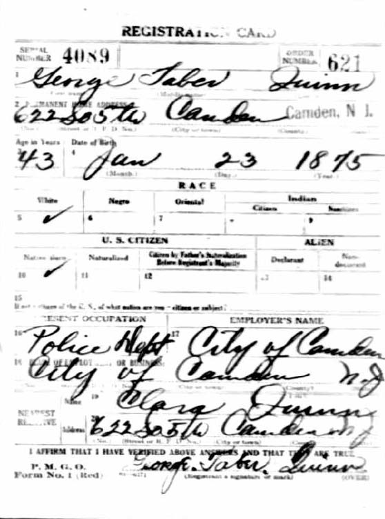 GEORGE TABOR QUINN was born in New Jerseyon January 23, 1875 to Davis Quinn and his wife, the former Estelle Abel. The family, which included older sister Violet, lived at 448 Benson Street as early as 1878 and were still there in 1888. Two younger children were born durung this time, Leila A. Quinn in 1880 and Albert Quinn in 1886. By 1890 the Quinns had moved to 450 Benson Street. The 1900 Census shows George T. Quinn had married. He was living with his wife of 1 year, Clara, at 538 Federal Street, and that he worked as a paperhanger. Fire Department records show him already to have been working as a fireman, however.