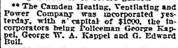 George William Andrew Kappel was born in Camden, September 12, 1887, and attended the public school of that city. Putting aside books, he went to work for Harrison Algor, heating contractor, and followed the trade with him for three years and a half. To complete his apprenticeship, he entered the employ of S. Faith & Company, in Philadelphia, for six months. Having mastered the trade, he and his father formed The Camden Heating Company, in May, 1905, and the concern was incorporated in 1907. The members of the firm are well known as specialists in heating and ventilating of all sorts, and are located at No. 8 Market Street, Camden. Mr. Kappel registered as professional heating engineer in New Jersey, having passed the examinations in October, 1921.