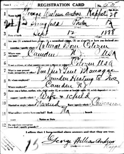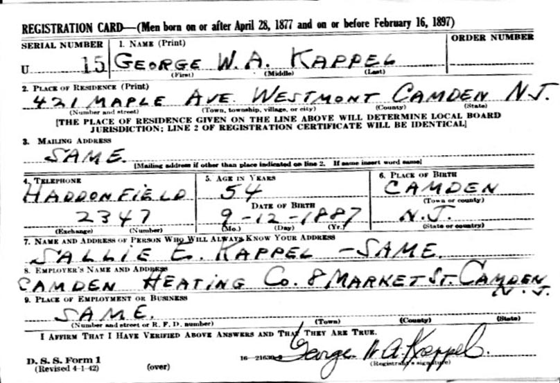 GEORGE WILLIAM ANDREW KAPPEL was born in Camden, September 12, 1887. His paternal grandfather, Frederick Kappel, came to Camden from Germany, and in his young manhood fought in the Civil War. Mr. Kappel's father, George Frederick Kappel, served briefly with the Camden Fire Department and was connected with the Camden Police Department for twenty-three years before his death, which occurred on July 6, 1924. George W.A. Kappel was actively involved with the Rotary Club of Camden in the mid 1930s. Last a resident of Collingswood NJ, George W.A. Kappel passed away in September of 1973. |