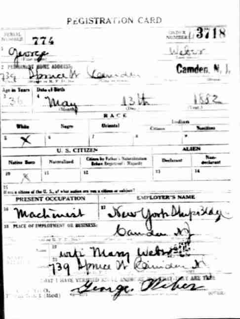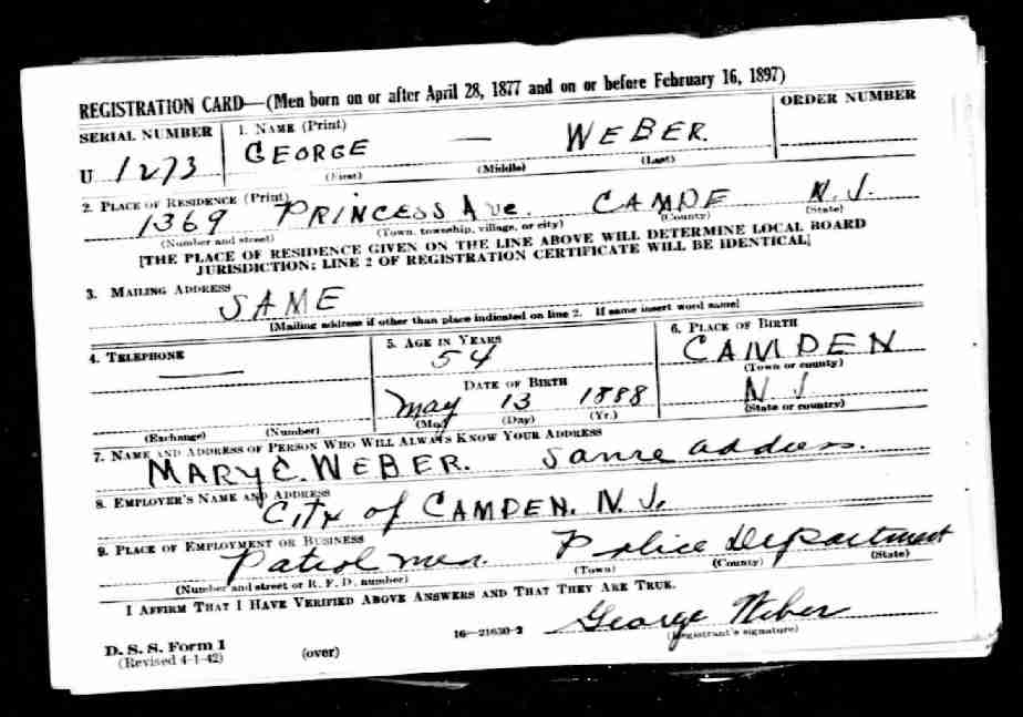 GEORGE WEBER was born May 13, 1882 in Camden to John and Barbara Weber. The 1884-1885 City Directory shows the family at 712 Walnut Street. By 1898 John Weber had died. His widow and son remained at that address through 1910. City Directories and the 1910 Census shows George Weber living with his widowed mother, Barbara Weber, at 712 Walnut Street. He worked as a machinist, in 1910 an iron works, later at a shipyard. The family was still at 712 Walnut Street as late as 1914. George Weber married shortly after the 1910 Census was enumerated. By September of 1918 he was living with his wife Mary at 739 Spruce Street, working as a machinist at New York Shipbuilding Corporation shipyard. The January 1920 Census shows the Weber family, which included son George T. Weber, born July 31st of 1912, at the Spruce Street address. The Webers had three boarders living with them at that time. Mary Weber gave birth to two more sons, Leo, on June 11, 1920, and Harry, on May 8, 1923. The Weber family remained at 739 Spruce Street into the 1930s. Sometime after 1920, George Weber took 6 years off if his age, probably in connection with obtaining his job on the police force. George Weber joined the Camden Police department on May 17, 1922, and was still with the department as late as January of 1949. His son, George T. Weber had joined the Police Department on August 24, 1940 and was also on the force at that time. The 1947 City Directory shows him living at 1369 Princess Avenue with his wife Mary, while son George T. Weber lived with his wife Johanna at 737 Line Street. George and Mary Weber are not listed in the 1956 New Jersey Bell Telephone Directory. |