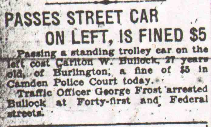 OPEN DRIVE ON SPEED, PARKING Camden Police yesterday began another drive against motorists who violate city traffic regulations. The campaign is an effort to reduce accidents. Lieutenant George Frost, in charge of the traffic bureau, announced the drive would continue for several weeks. On man was arrested today and fined $10 in police court by Judge Lewis Liberman. “I have instructed all motorcycle and traffic police to make a thorough check on double-parking, all day parkers, violators of one-way street signs and speeders,” Lieutenant Frost said today. “accidents have been occurring with increasing rapidity and we are going to do what we can to stop them.” The police official said many office workers in the central section of the city drive their cars to work and park them on busy streets for an entire day. He also pointed out this was the practice on streets adjoining the factory districts and said the two-hour parking law would be strictly enforced hereafter. John Ascola, 41, of 71 Market Street, Salem, was arrested by Patrolman Harry Kreher. Kreher said he chased the car driven by Ascola for more than a mile on Broadway. Asked by Prosecutor John H. Reiners if he knew the speed limit in Camden, Ascola replied: “Yes, 10 miles an hour.” He admitted to “doing 15”. Kreher said it was nearer 50. Ascola paid the fine. |