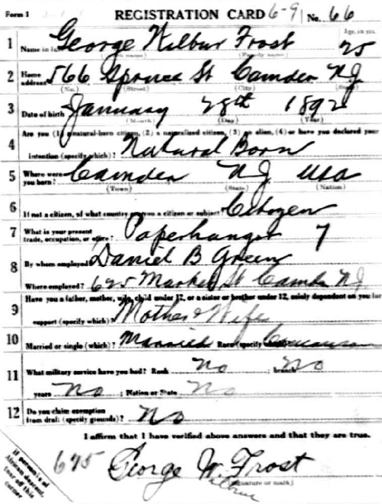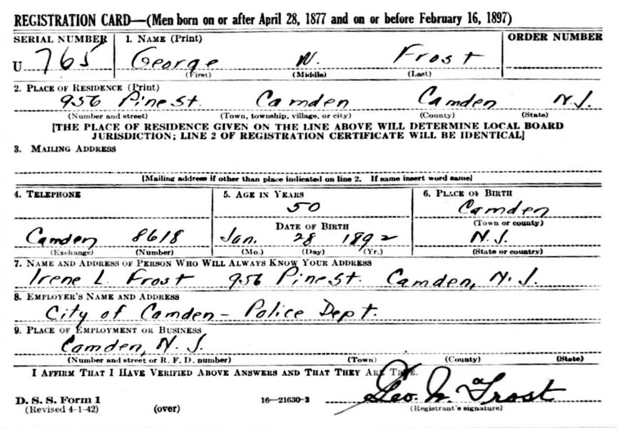GEORGE WILBUR FROST was born January of 1892 to Frederick and Amelia Frost. His father had come to Camden as a boy in the 1850s, and two of his uncles, Henry Frost and George Frost, had served as members of the Camden Fire Department in the 1870s and early 1880s. The family, which included older brothers William and Edward, lived at 566 Spruce Street when the census was taken in 1900. Sadly, Frederick Frost passed away prior to the 1910 Census. Older brother William married, and a son, Wilbur, was born in three months before the 1910 Census was taken, unfortunately, his mother died. Still living at 566 Spruce Street, George W. Frost was married when he registered for the draft in June of 1917. After serving in the United States Navy during World War I he returned to Camden. By January of 1920 his marriage had ended in divorce, however, he had secured work with the Camden Police Department. His cousin, Frank Frost, had been a motorcycle policeman prior to World War I. The 1923 City Directory shows George Frost had remarried. He and his new wife, Irene Burr Frost lived at 956 Pine Street, and were still there in 1943. Mother-in-law Anna Burr also resided there. By 1930 George Frost had risen to the rank of Lieutenant. By the mid-1930s George Frost was in charge of the Camden Police Department's Traffic Bureau. Unexpectedly, Chief of Police Arthur Colsey died in his sleep of a heart attack on September 15, 1939. Captain Ralph Bakley was named Acting Chief of Police a few days later by Commissioner Mary Kobus, Camden's Director of Public Safety. A few months later, the New Jersey State Civil Service Commission called for a test for the Chief's position. Ralph Bakley scored third, with George Frost getting the top score. Chief Bakley continued to serve in the position of Acting Chief until March of 1942, when Chief Frost was confirmed in the position. Ralph Bakley retired few days later. Not long after the 1943 Camden City Directory was compiled, George W. and Irene Frost moved to 564 Spruce Street. They were still atthat address when the 1947 Camden City Directory was compiled. Chief Frost retired shortly before Howard Unruh's September 1949 shooting spree. Acting Chief Samuel Johnson replaced him. He appears to have moved out of Camden County, as he does not appear in any directory after 1947. Last a resident of Clearwater, Florida George W. Frost passed away on May 30, 1979. |