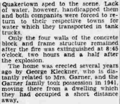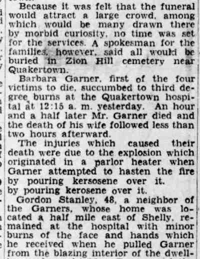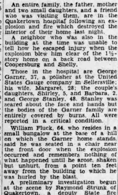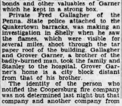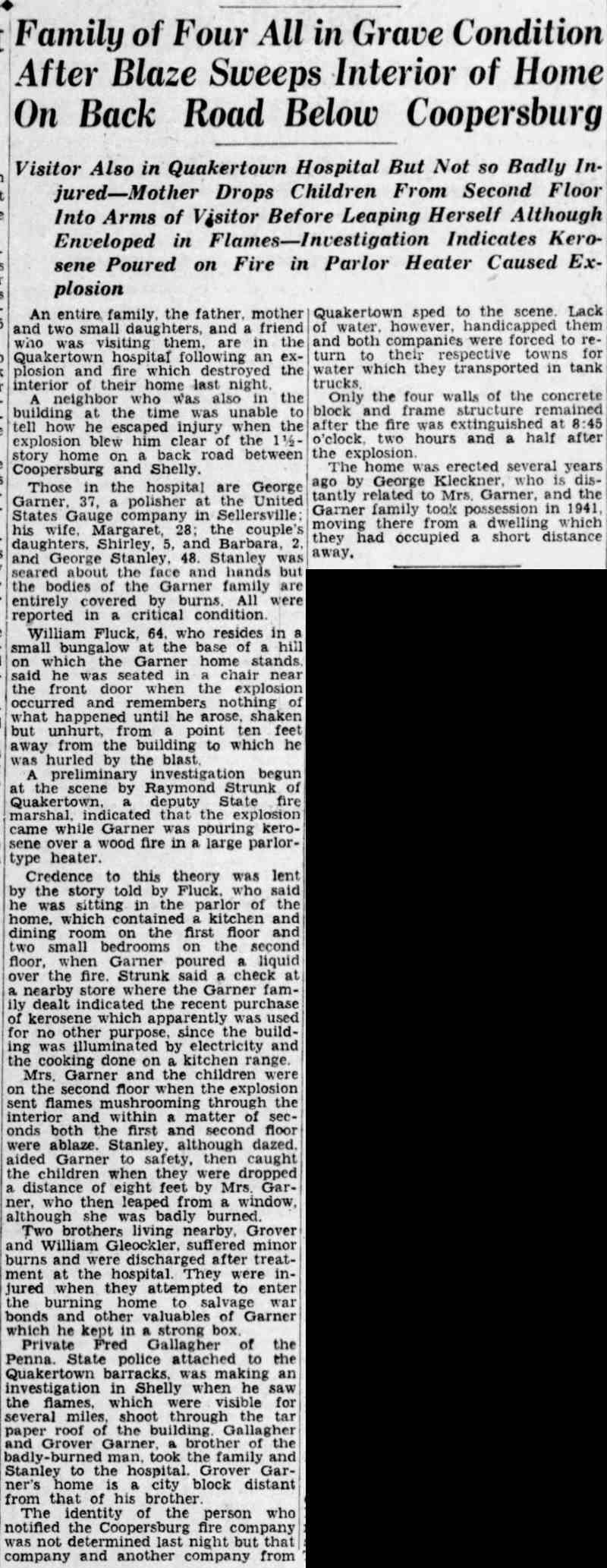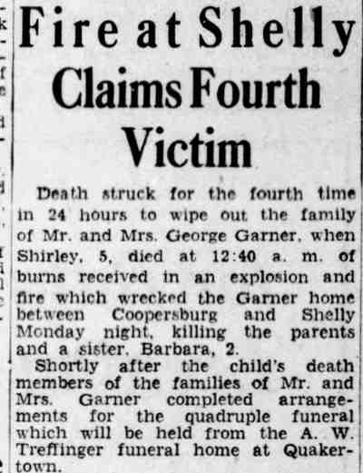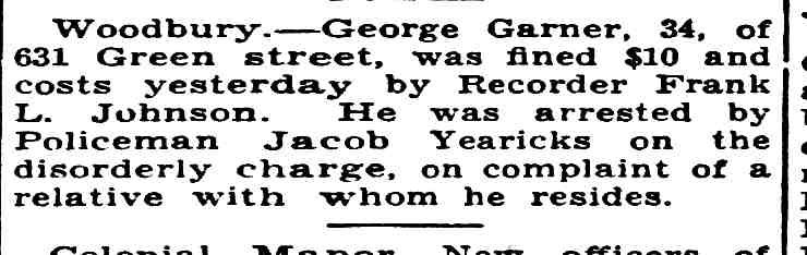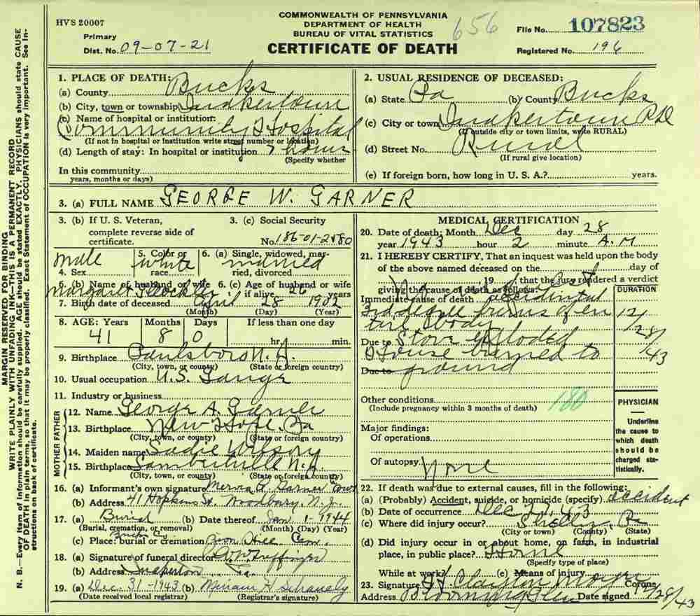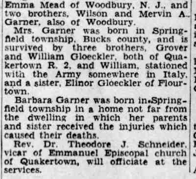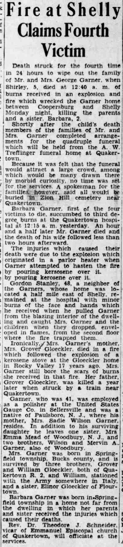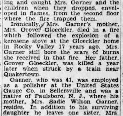 By February of 1936 George W. and Farabell Garner had parted ways, He was then living with a relative in Woodbury, New Jersey. His wife and children appear to have moved to East Camden and by 1955 to the Locustwood section of Delaware Township (present-day Cherry Hill), New Jersey. George W. Garner had remarried and was living near Quakertown, Pennsylvania with his wife, the former Margaret Gloeckler, and daughters Shirley and Barbara in December of 1943. On December 28 fire broke out at the Garner home and all four members died as a result of burns suffered. The family was buried at Zion Hill Cemetery, Zion Hill, Pennsylvania. There was no report of George W. Garner's death in Camden newspapers. Farabell Garner is listed at 205 South 36th Street in the 1940 and 1943 Directories. The Garners are not listed in the 1947 Camden City Directory. Farabell Garner was residing in Willingboro NJ when she died in December of 1973. |
