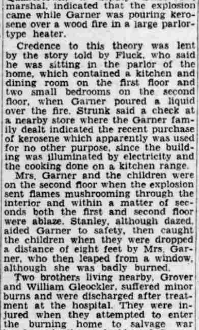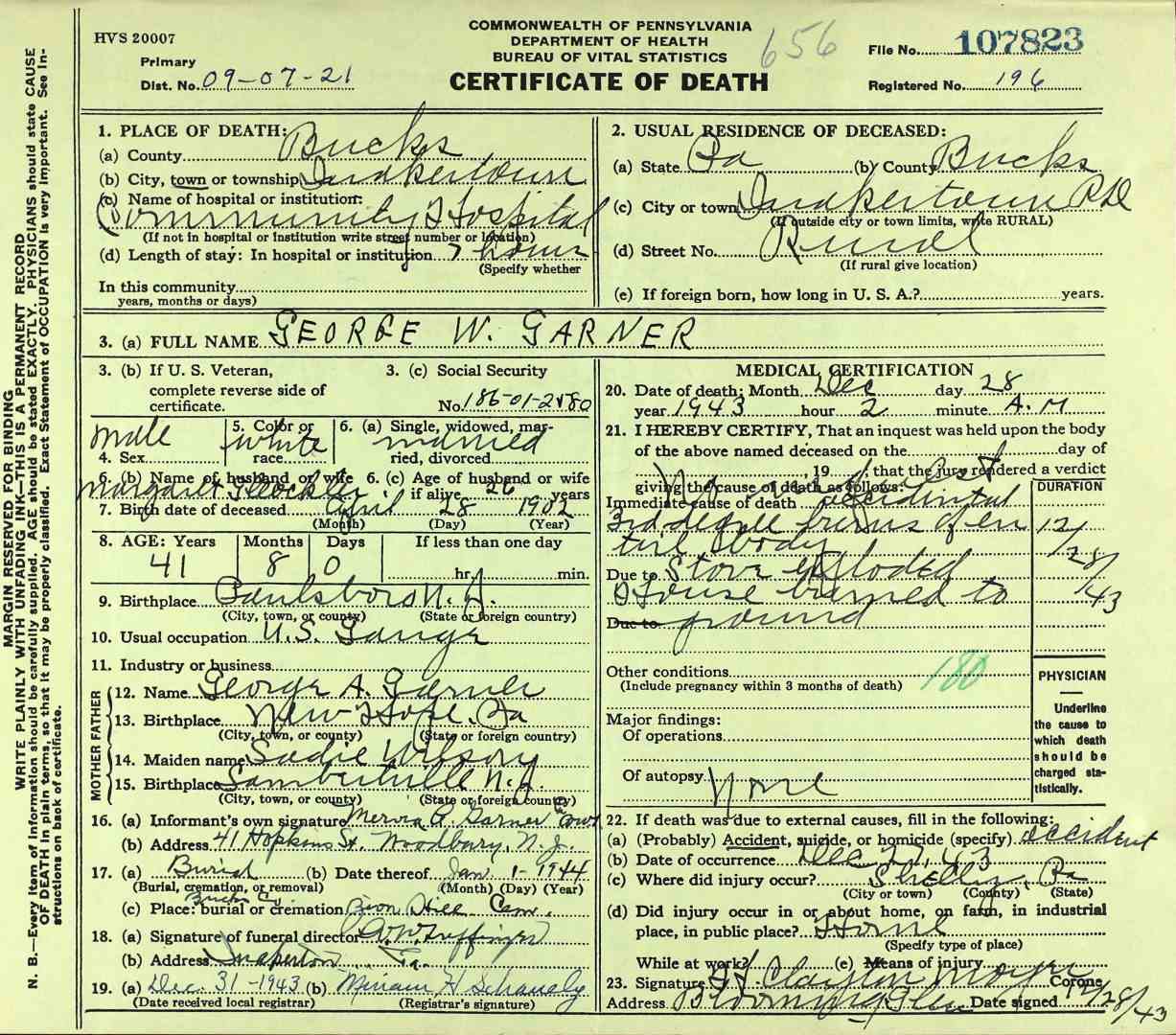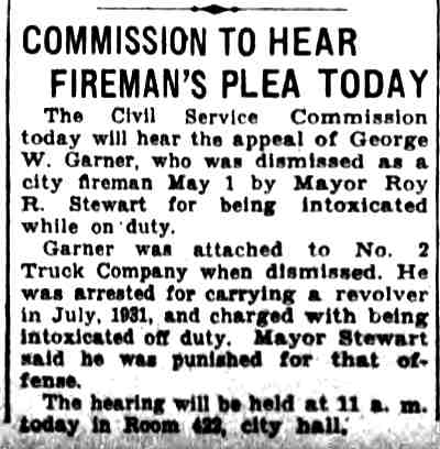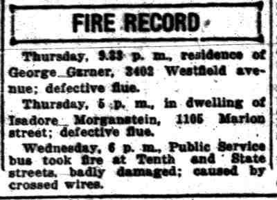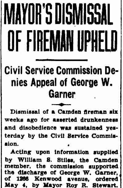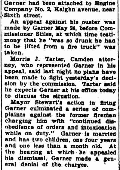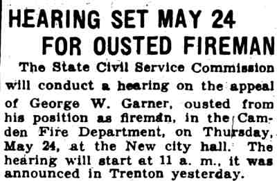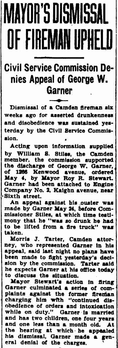 GEORGE WASHINGTON GARNER was a member of the Camden Fire Department in the 1920s and 1930s. He was born in Paulsboro, New Jersey on April 28, 1902 to George Alfred Garner and his wife, the former Sadie Wilson. His father was a barber. George W. Garner had an older sister, Emma, and two younger brothers, Wilson B. Garner and Mervin Garner. George W. Garner served with the United States Navy from March 21, 1921 to March 25, 1925. He married Farabell Piper, who worked as a clerk at Camden's post office, in October of 1923. The Garners lived with Farabell's parents, Charles and Farabell Piper, who had a variety shop at 2642 Federal Street in East Camden, which sold candy and patent medicines. By the end of 1924 the young couple had moved to 3402 Westfield Avenue. Upon his discharge he came back to Camden. He was appointed to the Camden Fire Department on April 4, 1928. He began his service with Engine Company 4. By January of 1930 he had been assigned to Ladder Company 3. When the City Directory was compiled for 1929, he and wife Farabell were back at 2642 Federal Street. A daughter Joan, was born early in 1930. The family were living with Mrs. Garner's widowed mother. They were still at that address in April of 1930. Fire Department records from 1931 show them living at 738 York Street. He was living at 410 Rand Street in December of 1932. By the summer of 1933 the Garners had moved to 235 Morse Street . |