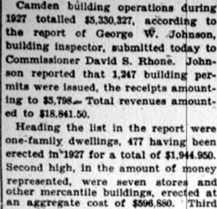 GEORGE W. JOHNSON was born in New Jersey in 1872. He appears as a carpenter living at 571 Clinton Street in the 1890-1891 Camden City Directory. George Johnson married late in life, at the age of 43. At the time of the 1920 Census, he was living with his wife, Loretta, at 765 Line Street and working as a building inspector for the City of Camden. Mrs. Johnson was an active member of the First Methodist Episcopal Church at South 6th and Stevens Street. George W. Johnson later served as the head City Building Inspector for the city of Camden, under the direction of Winfield S. Price, who served as Mayor of Camden from 1927 to 1931. George and Loretta Johnson were still living at 765 line street as late as 1947. He had long since retired. |