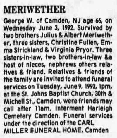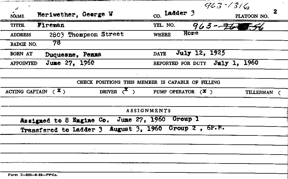 GEORGE W. MERIWETHER was born in Duquesne, Pennsylvania on July 12, 1925, one of at least five children born to Albert and Minnie Meriwether. By April of 1930 the family had relocated to Newark, Ohio. George Meriwether was still living in Ohio when he was issued a Social Security card. He came to Camden at some point after the compilation of the 1947 Camden City Directory. On June 27, 1960 George W. Meriwether was appointed to the Camden Fire Department. He was living at 214 North 28th Street in East Camden at the time of his appointment. Assigned to Engine Company 8 at 619 Kaighn Avenue, he reported for duty on July 1, 1960. On August 3, 1960 he was transferred to Ladder Company 3 at North 27th Street and Federal Street in East Camden, a short walk from his home at 2803 Thompson Street. He retired on pension on August 1, 1985. George W. Meriwether made his home on Thompson Street until his death on June 3, 1992. His next door neighbor for many years was fellow Camden fire fighter Andrew Foreman. |