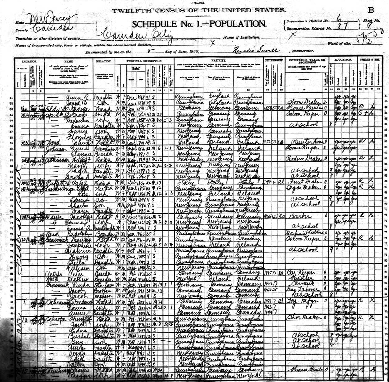 GEORGE W. SPICKS was born to German-born parents in Philadelphia PA on February 13, 1861. He married at the age of 20 and soon moved to New Jersey. He had moved to the 2000 block in what was then Stockton Township, present-day East Camden, by 1887. Originally a tailor by trade, the 1887-1888 Camden City Directory shows him following that profession. The following year, however, he is listed as a bartender. The 1890-1891 City Directory indicates that he may have had an interest in the Junction Hotel at 21st and Federal Streets. The 1900 Census shows him living at 2034 Federal Street with his wife Fredericka and three children, Emma, Harry, and Florence. Two other children had not survived, and sadly, young Harry Spicks would not be alive when the 11910 Census was taken. By 1910 he had acquired the saloon at 2046 Federal Street, the southwest corner of Federal Street and Marlton Avenue. The Spicks family lived at and operated this saloon through at least 1921. The 1920 Census shows George and Fredericka Spicks, their daughters Florence and Emma, and Emma's husband Frank Steinbach. By the end of 1923 George W. Spicks had gotten out of the saloon business. He was living with his daughter Emma and her husband Frank at 55 South 28th Street in East Camden when he took a vacation to Havana, Cuba. He returned to the USA by way of New Orleans in December of that year. George W. Spicks was still living on South 28th Street as a late as 1930, but had moved across the street to 62 South 28th. This was the home of his other daughter, Florence and her husband Charles Windstein. By 1935 he had moved to 52 South 28th, with his daughter Emma and son-in-law Frank Steinbach. George W. Spicks died at home on January 5, 1947. |