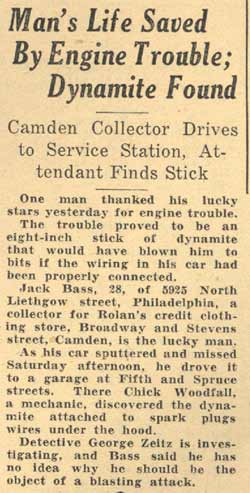 HERE IN NUMBERS QUIZ Arrests in the numbers racket in Camden continued today simultaneously with the continuation of the inquiry into the murder of City Detective William T. Feitz Jr. With the Feitz slaying probe in its eleventh day- the detective was slain September 2 at 243 Sycamore Street, an alleged disorderly house- city and county authorities were still questioning witnesses in an endeavor to obtain sufficient evidence to name the murderer or murderers. The arrest this morning of Crawford Smith, 51, of 702 Carman Street, as a numbers writer, brought the total of those apprehended this week in the numbers racket to 10. At the same time Police Judge J. Harry Switzer held Fred Klosterman, 33, of 1050 Mechanic Street, in $5000 bail for the grand jury on a charge of operating a numbers game. Klosterman's brother, Joseph Klosterman, 35, of 1400 Mechanic Street, was released in $3000 bail yesterday by Judge Switzer on a charge of operating a numbers lottery. The Klostermans. according to police, are among the topnotch numbers barons of the city. Both pleaded not guilty to the charges against them. No Testimony Taken Fred Klosterman surrendered voluntarily yesterday afternoon when he learned that police were seeking him as an alleged numbers operator. He was arraigned in police court today on complaint of George Zeitz, a city detective, who charged him with operating a numbers game. Police did not reveal where Fred Klosterman allegedly operated. There was no testimony taken at the hearing of Fred Klosterman. His bail bond was signed by John Zubien. Police say they do not know Zubien's address. Mrs. Anna Bubnoski, of 1426 Mount Ephraim Avenue, posted the $3000 bail for Joseph Klosterman. Zeitz also had made complaint against him. Fred Klosterman surrendered yesterday, according to police, after a defendant in police court testified that he was employed at an alleged numbers bank operated by Fred Klosterman. Zeitz swore to a warrant for Fred Klosterman's arrest based on the police information, he said. Hearing Tomorrow Smith, who was arrested by George Clayton, a policeman, will be given a hearing in police court tomorrow as an alleged numbers writer. Meanwhile no disposition was made in the case of Mrs. Mollie Schwartz, 42, who was arrested yesterday on a charge of operating a still at a double dwelling at 3404 Rosedale Avenue. Police Lieutenant John Potter said the woman admitted operating the still. A man said to be a brother of Mrs. Schwartz fled in his undershirt at the time of the raid, as Sergeant Edward Hahn and Policeman Joseph Keefe were making the arrest and seizure. The seizure included 13 barrels of alleged mash, a stove, one cooler, three gallons of liquor, and a 75 gallon still. Police reported that one of two cars without license tags which had been parked in front of the house disappeared later. Cops to Aid State Strict cooperation with the State Alcoholic beverages Commission in the detection, closing up, and prosecution of speakeasies is being given by the Camden Police Department. That statement was made today by Mayor Roy R. Stewart, who is the director of the department of public safety, and came as a result of an interview which Howard B. Dyer, an investigator with the state beverage commission had with the mayor. Dyer was formerly deputy city clerk. "Dyer came in and asked for the cooperation of the police department," said Mayor Stewart, "and I told him we would cooperate fully". The state alcoholic beverage commission, through its investigators, has been busy in running down speakeasies, stills and other illicit liquor practices. |