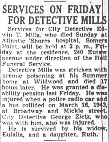 GEORGE ZEITZ was born around 1893 in Pennsylvania to Frederick W. and Clara Zeitz. The Zeitz family later came to New Jersey. After serving in World War I, George Zeitz returned home to live with his mother, father, and brother Thomas at 118 Geneva Avenue in Haddon Township NJ. George Zeitz then was working in elevator construction, while his father listed his occupation for the January 1920 Federal Census as "Shipping Meat". By 1923 George Zeitz had married Jennie Maguire. Their daughter Clara was born in around 1924. By January of 1930 George Zeitz had joined the Camden Police Department. The 1930 Federal Census, taken in April of that year, shows the Zeitz family living at 641 Grant Street in North Camden. Mother-in-law Jennie Maguire, then 75, also lived with them. George Zeitz was traveling in a police radio car with Detective Edwin T. Mills when a bus collided with their vehicle on March 16, 1943 at Broadway and Mickle Street. Both officers were injured. George Zeitz was promoted to Detective by May of 1934. He was still on the force in 1947, according to the Camden City Directory for that year. At that time he was living at 340 Kaighn Avenue in South Camden, with a second wife, Helen L. Zeitz. George and Helen Zeitz do not appear in the 1959 New Jersey Bell Telephone Directory for Camden County. It appears that may have passed away by that time. His wife Helen died in January of 1981. |