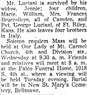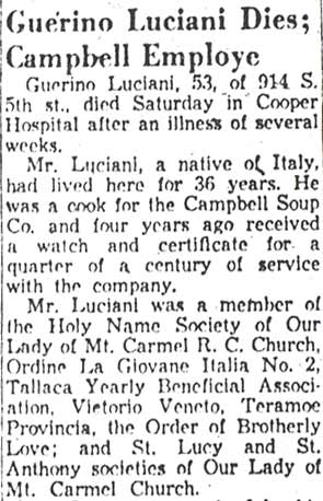 GUERINO LUCIAN I was born in Italy around 19801. He came to Camden around 1918 and got a job at Campbell Soup about 1925. He would remain a Campbell employee the remainder of his life. Guerino Luciani was a member of the Holy name Society of Our Lady of Mount Carmel Church; the St. Lucy and St. Anthony societies of Our Lady of Mount Carmel Church; Teramoe Provincia, Order of Brotherly Love; Loggia Vittorio Veneto of the Sons of Italy; Ordine La Giovane Italia No. 2, and the Tallaca Yearly Beneficial Association. Guerino Luciani last made his home at 914 South 5th Street. He passed away after an illness of several weeks at Cooper Hospital Hospital on August 28, 1954. Survived by his wife Jennie, two sons and two daughter. He also was survived by four brothers in Italy. He was buried at New St. Mary's Cemetery in Bellmawr NJ. |