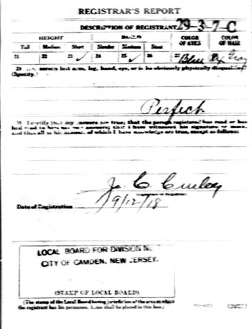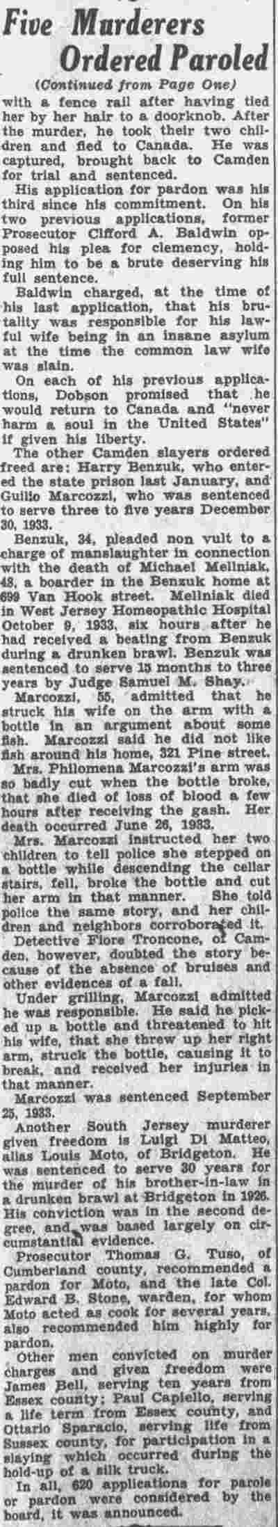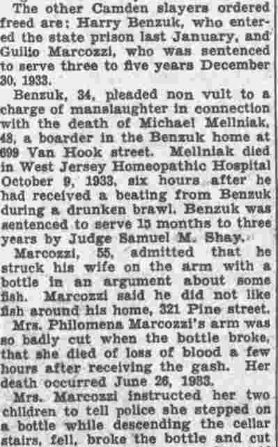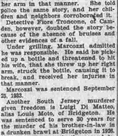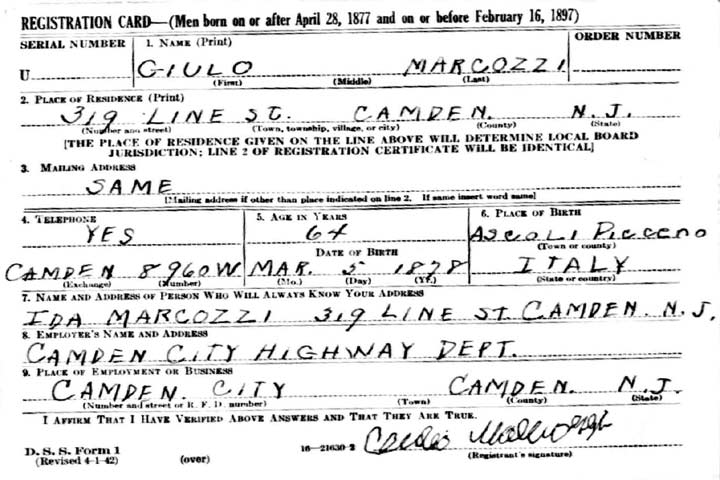 GUILIO MARCOZZI was born in Ascoli Piceno, Italy on March 5th, 1878. It is probable that he was related to Bishop Giuseppe Marcozzi, who was born in Ascoli Piceno on March 24, 1873, and who served as the Bishop of Calvi e Teano from August of 1926 until his death in April of 1940. Guilio Marcozzi came to America in 1905 but did not stay. In 1913 he retuned with his young wife, the former Philomena Giardini, aboard the steamship Hamburg, sailing from Genoa, Italy in September of 1913. By 1917 they had settled at 317 Line Street in Camden with his wife Philomena, son David, and daughter Louise; daughters Catherine and Ida would follow. Over the nest 25 years Guilio Marcozzi would live at 317, 319, and 321 Line Street. Sadly, in June of 1933 he was responsible for his wife's death when she was cut on the arm during a domestic dispute. Marcozzi was arrested for murder, however, within days the charge was reduced to manslaughter, and by 1935 the case had been put to rest. Guilio Marcozzi worked for the city of Camden's public works and highway departments as a laborer in the late 30s and 1940s. He was still living in South Camden as late as 1947, sharing the house at 319 Pine Street with his son David, then a purchasing agent. David Marcozzi later moved to Haddon Heights, NJ. |