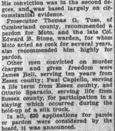 PROMOTES 3, REHIRES 3, FIRES 4 Three dismissals, three promotions and four reinstatements and two new hirings were announced yesterday by City Commissioner Henry Magin, director of public works. Dismissed were Eugeni Gatti, 208 Washington street; guilio marcozzi, 321 Line Street, and George Pollard, 336 Stevens street, all temporary laborers at $4 a day. James Carr, 1409 Princess avenue, a laborer on asphalt repairs at $6 a day, is reclassified as general foreman of the department, effective today, at $2100 a year, subject to Civil Service promotional examination. John Dziekanski, 1414 Mt. Ephraim avenue, a laborer in the building bureau at $6 a day, is reclassified as architectural draftsman at $2100, also subject to examination. Oscar Moore, 543 Washington street, Ninth Ward freeholder, will receive $6 instead of $5 a day as a temporary laborer. Reinstated were Lawrence Abbott, 910South Third Street, a brother of Frank Abbott, deputy to Mayor Brunner, as a temporary laborer at $5 a day; Anthony Carrier, 416 Benson Street, a temporary laborer at $4 a day; James Jackson, 1117 Lawrence street, and Otis Still, 261 North Eleventh street. All were discharged by Frank J. Hartmann, Magin's predecessor. |